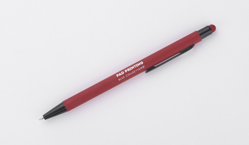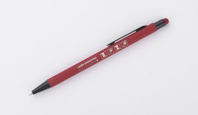 Klasyczny, cienki długopis PRIM wykonany z aluminium pokrytego gumowaną powłoką typu soft touch. Na górze końcówka do obsługi ekranów dotykowych w kolorze dopasowanym do korpusu długopisu. Wykończenia w kolorze czarnym. Długopis automatyczny. Wkład typu X20 w kolorze niebieskim.