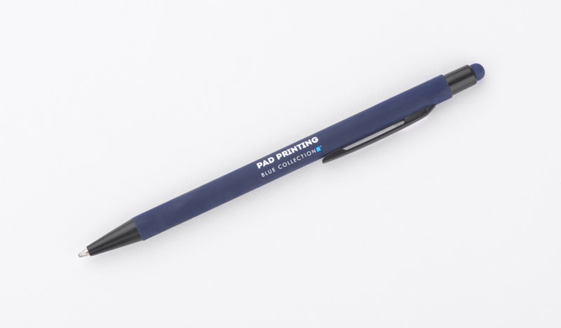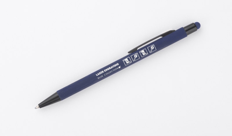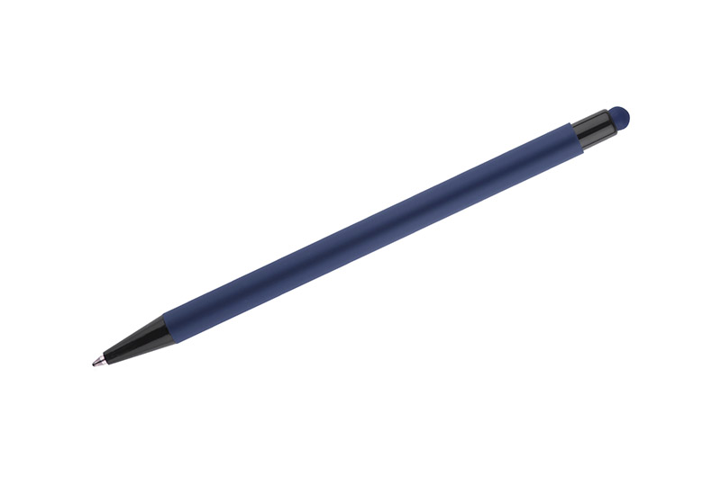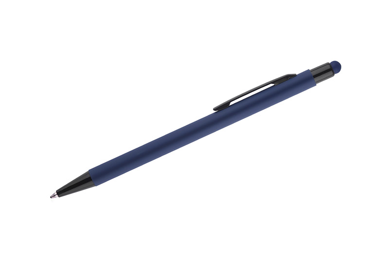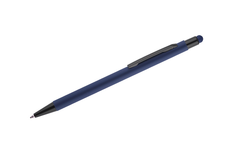 Klasyczny, cienki długopis PRIM wykonany z aluminium pokrytego gumowaną powłoką typu soft touch. Na górze końcówka do obsługi ekranów dotykowych w kolorze dopasowanym do korpusu długopisu. Wykończenia w kolorze czarnym. Długopis automatyczny. Wkład typu X20 w kolorze niebieskim.