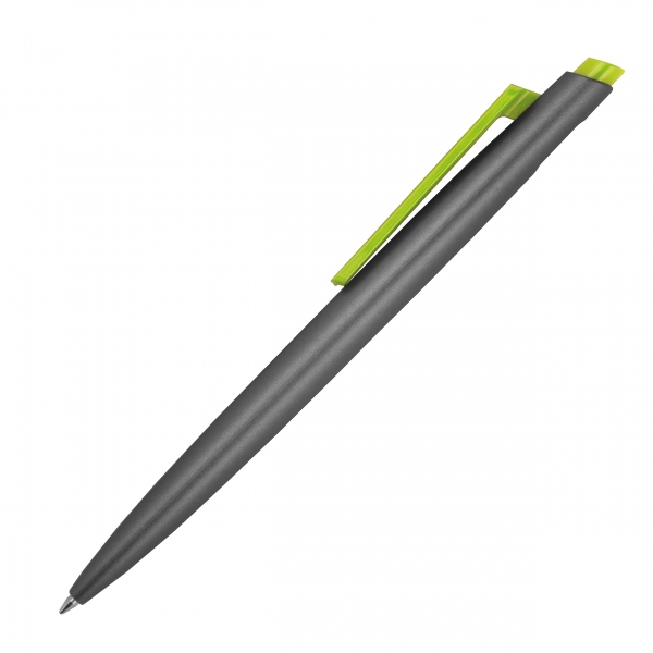 Długopis wykonany z plastiku z recyklingu, z kolorowymi akcenatami i wkładem piszącym na niebiesko.