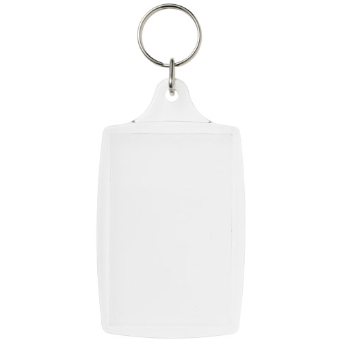 Breloczek L4 z metalowym pękiem na klucze. Metalowy pierścień cechuje płaski profil, który idealnie nadaje się do wysyłek. Wymiary wkładu do druku: 7 cm x 4,5 cm.