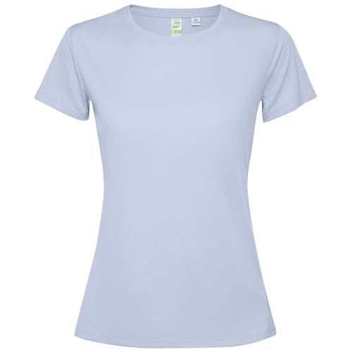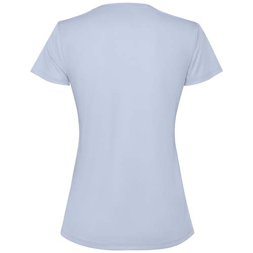 Dopasowana, techniczna koszulka z krótkim rękawem dla kobiet. Kołnierz z pasującymi kolorystycznie szwami. Tył nieco dłuższy niż przód. Szwy boczne przesunięte do przodu.