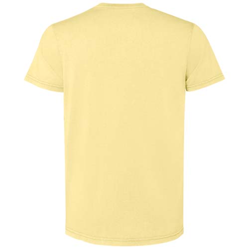 Męska koszulka z krótkim rękawem. Wykończenie uzyskane dzięki poddaniu działaniu wybielacza w celu uzyskania smug lub odbarwień. Okrągły dekolt wykończony prążkowanym ściągaczem 1x1. Ścieg kryty ton w ton z wykończeniem na wysoki połysk.
