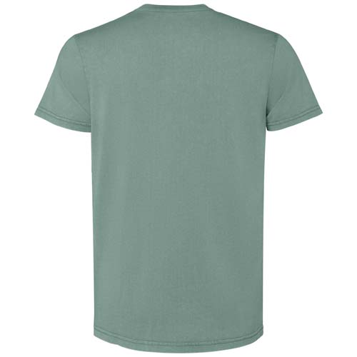 Męska koszulka z krótkim rękawem. Wykończenie uzyskane dzięki poddaniu działaniu wybielacza w celu uzyskania smug lub odbarwień. Okrągły dekolt wykończony prążkowanym ściągaczem 1x1. Ścieg kryty ton w ton z wykończeniem na wysoki połysk.