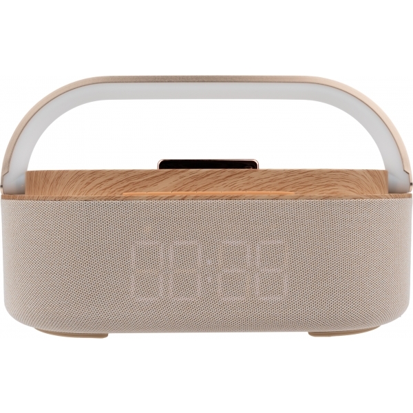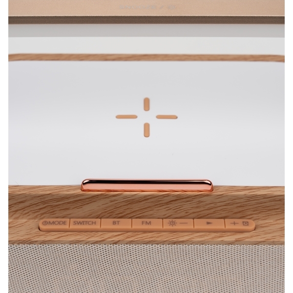Głośnik bluetooth z wbudowaną ładowarką indukcyjną, cyfrowym wyświetlaczem, akumulatorem o pojemności 2 000 mAh, radiem, budzikiem, uchwytem na telefon oraz lampką o trzech stopniach jasności.