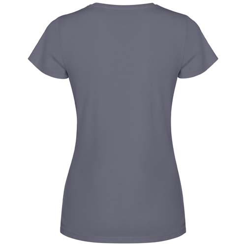 Damska koszulka z krótkim rękawem Wykończenie uzyskane dzięki poddaniu działaniu wybielacza w celu uzyskania smug lub odbarwień, okrągły dekolt wykończony prążkowanym ściągaczem 1x1 i boczne szwy. Ścieg kryty ton w ton przy dekolcie.