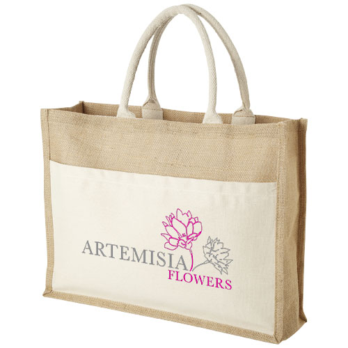 Niezależnie od celu podróży, torba Mumbay tote jest idealnym towarzyszem. Posiada dużą komorę główną oraz przednią kieszeń, w której z łatwością można przechowywać wszelkie drobiazgi. Torba składa się z juty i płótna, co oznacza, że torba Mumbay tote bag jest świetną opcją, gdy szukasz bardziej zrównoważonej torby na zakupy. Gęstość tkaniny 320 g/m² sprawia, że torba jest bardzo wytrzymała, długowieczna i nadaje się do noszenia ciężkich przedmiotów w głównej komorze.