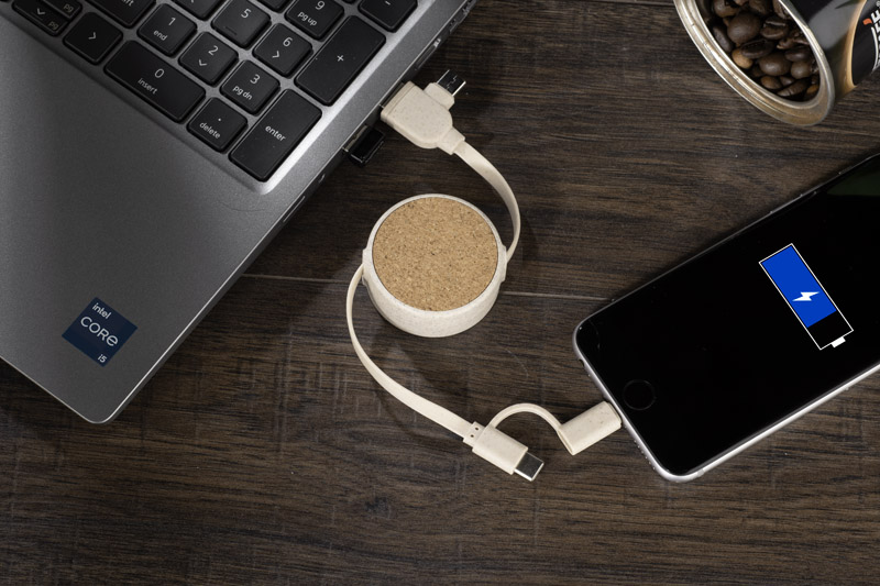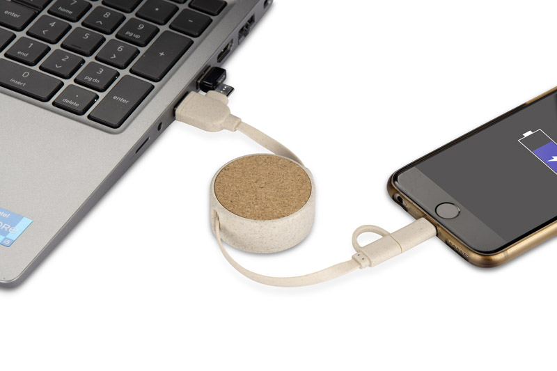 Kabel do ładowania SLOPI łączy naturalne materiały z funkcjonalnością. Wykonany z korka oraz tworzywa ze słomy pszennej, oferuje końcówki USB, 2 x USB C oraz Lightning, zapewniając uniwersalność i wygodę. Zwijana konstrukcja ułatwia przechowywanie, a naturalny wygląd nadaje mu unikalny charakter. Idealny jako praktyczny gadżet promocyjny.