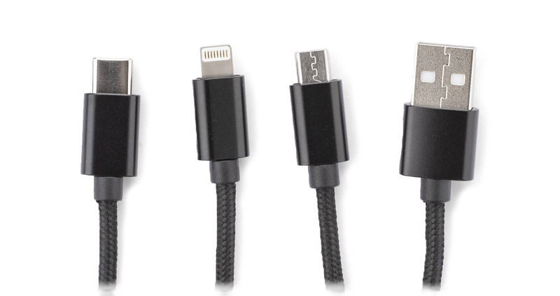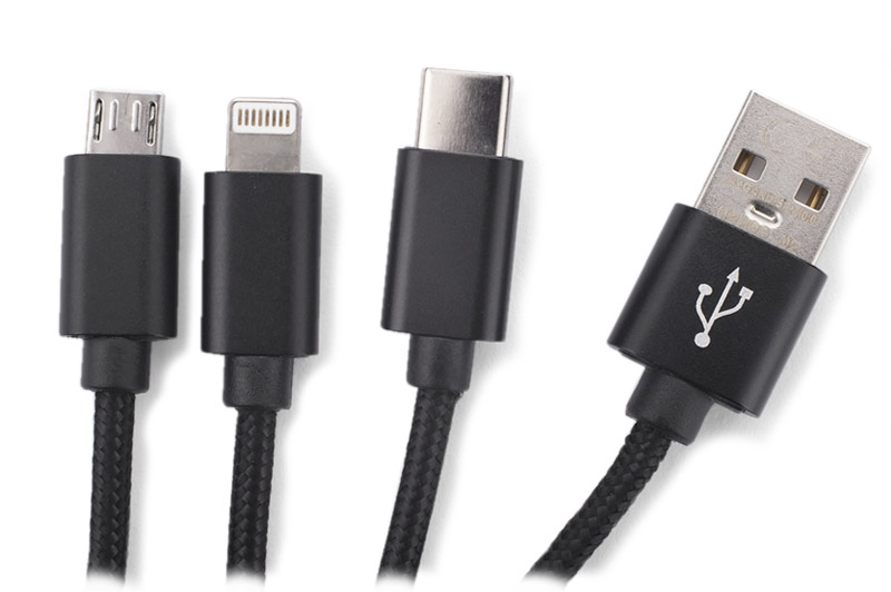 Kabel USB 3 w 1 TAUS do ładowania różnych urządzeń posiada trzy końcówki: micro USB, Lightning (iPhone) i USB typu C. Kabel jest powleczony tkaniną, a końcówki USB są wykonane z metalu. Praktyczny gadżet dla każdego użytkownika mobilnych urządzeń.