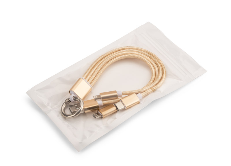 Kabel USB 3 w 1 TAUS do ładowania różnych urządzeń posiada trzy końcówki: micro USB, Lightning (iPhone) i USB typu C. Kabel jest powleczony tkaniną, a końcówki USB są wykonane z metalu. Praktyczny gadżet dla każdego użytkownika mobilnych urządzeń.