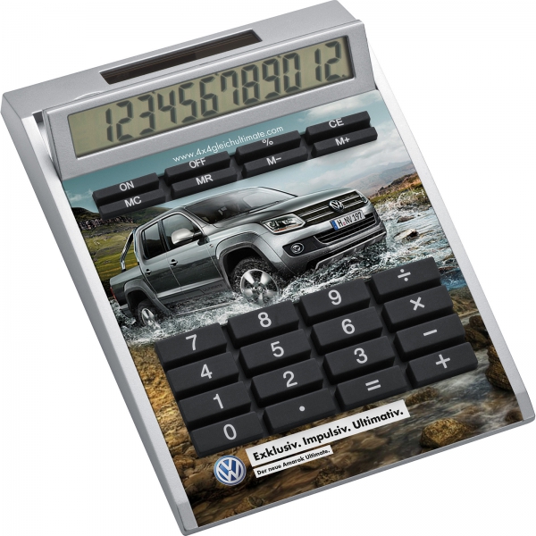 Niepowtarzalny kalkulator z kolekcji CrisMa z 12 cyfrowym wyświetlaczem, wykonany z plastiku w kolorze srebrnym. Posiada nietypową nakładkę w kolorze białym, która może zostać w całości nadrukowana. Zasilanie solarne i na baterię.