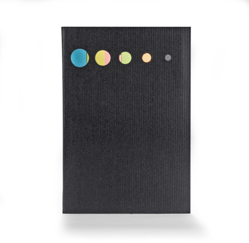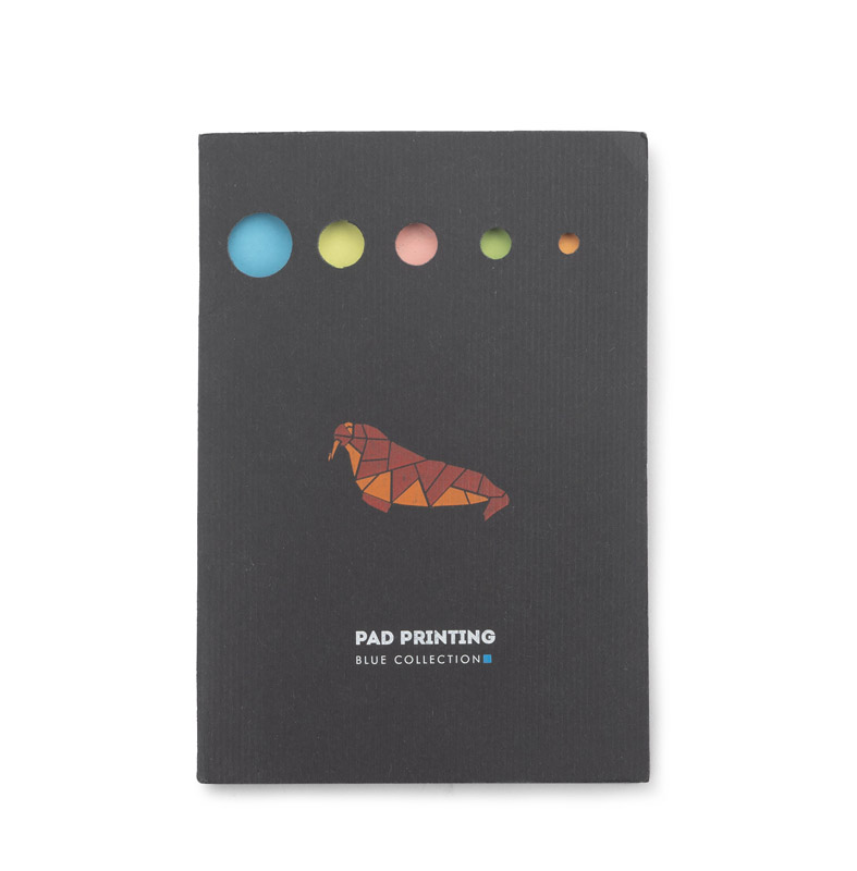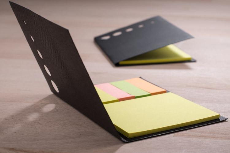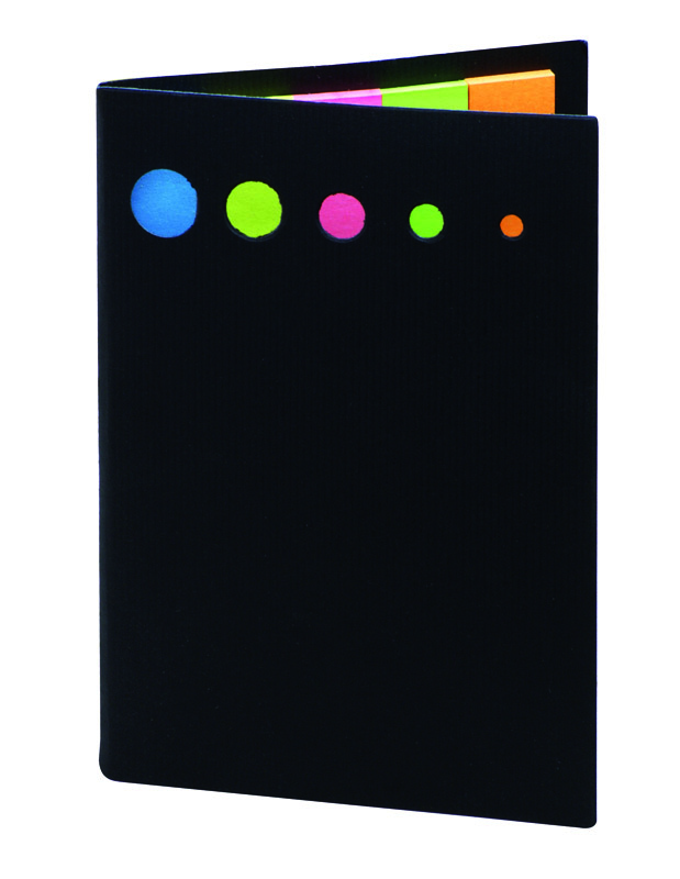 Karteczki samoprzylepne w pięciu kolorach oraz samoprzylepny notesik, umieszczone w czarnej okładce. Logo nadrukujemy na etui metodą tampodruku.