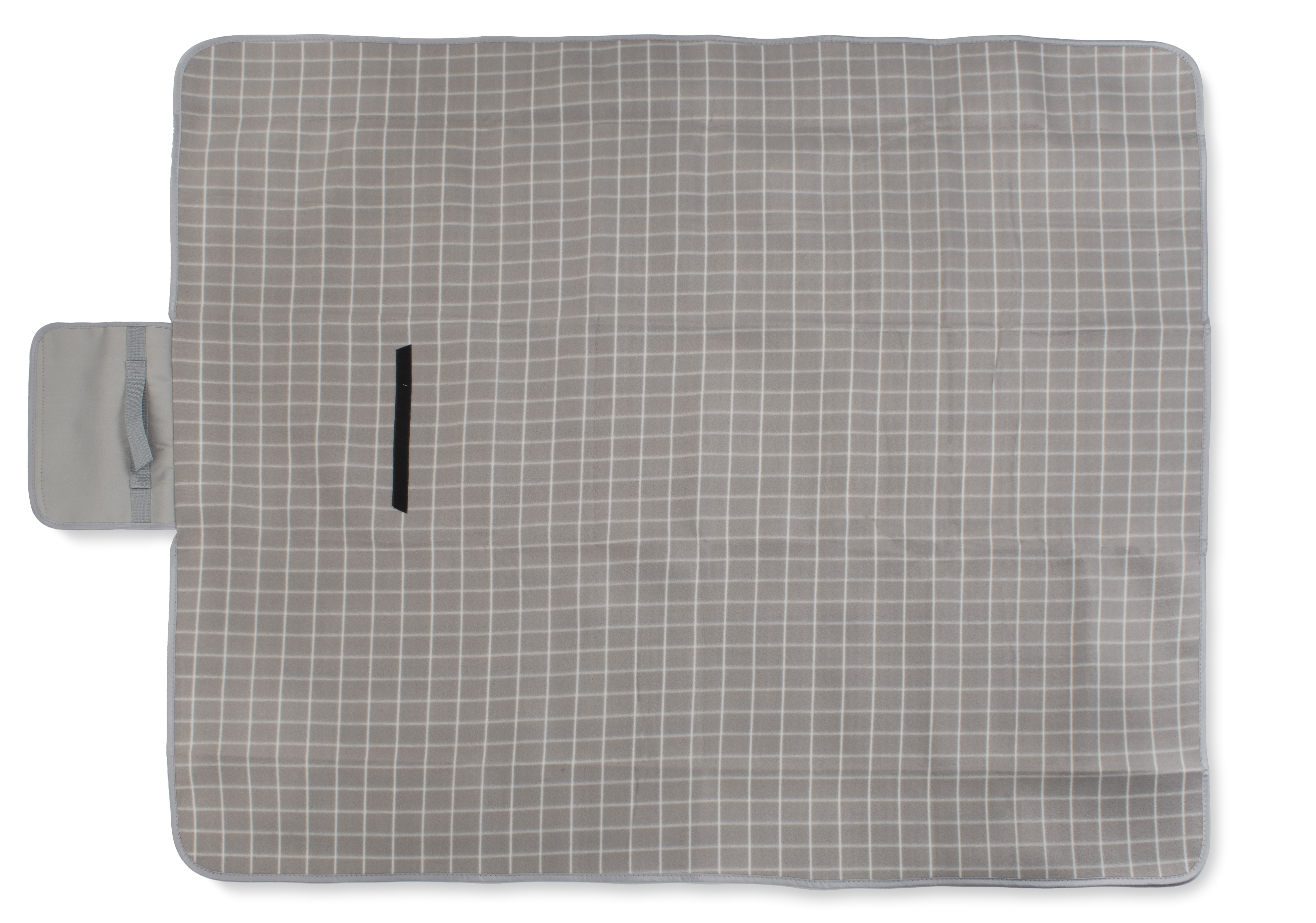Koc piknikowy wykonany z gładkiego polaru w klasyczny wzór w kratę. Od spodu posiada wodoodporną warstwę PET. Po złożeniu klapa zapinana na rzep.