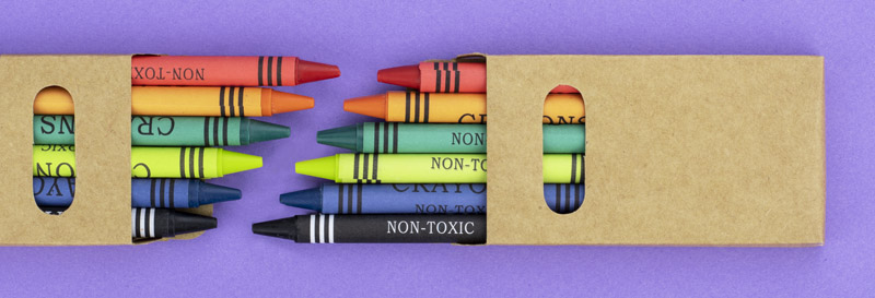 Kredki świecowe w sześciu kolorach, zapakowane w ekologiczny kartonik z okienkiem. Logo nadrukujemy na kartoniku.