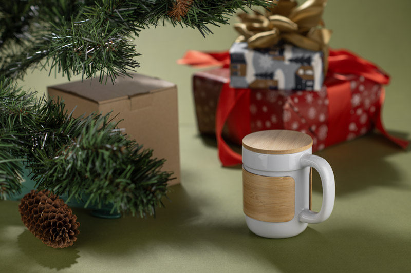 Kubek MUGGI o pojemności 350 ml łączy klasyczną formę z nowoczesnymi detalami. Wykonany z wysokiej jakości ceramiki, wyposażony jest w bambusową pokrywkę i dopasowaną opaskę termiczną, która chroni dłonie przed ciepłem napoju. Pokrywka może również pełnić funkcję podstawki, co zwiększa wygodę użytkowania. Naturalne akcenty bambusa nadają kubkowi wyjątkowy, przyjemny wygląd, a solidne ucho zapewnia komfortowy chwyt. Doskonale sprawdzi się w biurze lub jako element zestawu upominkowego.