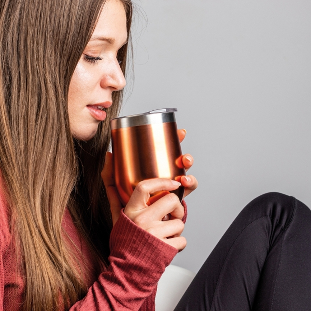 Kubek ze stali nierdzewnej o podwójnych ściankach (izolacja próżniowa) i pojemności 300 ml. Przezroczyste plastikowe wieczko posiada silikonową uszczelkę. Otwór do picia nie jest zamykany, wypełniony kubek należy przechowywać w pozycji stojącej.