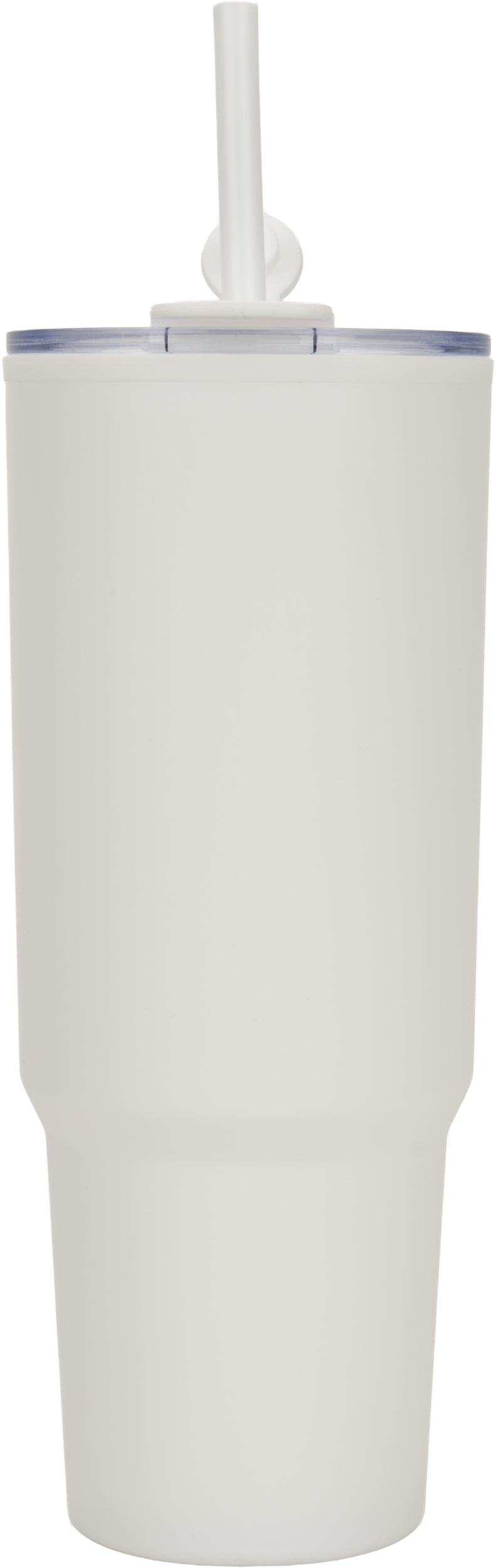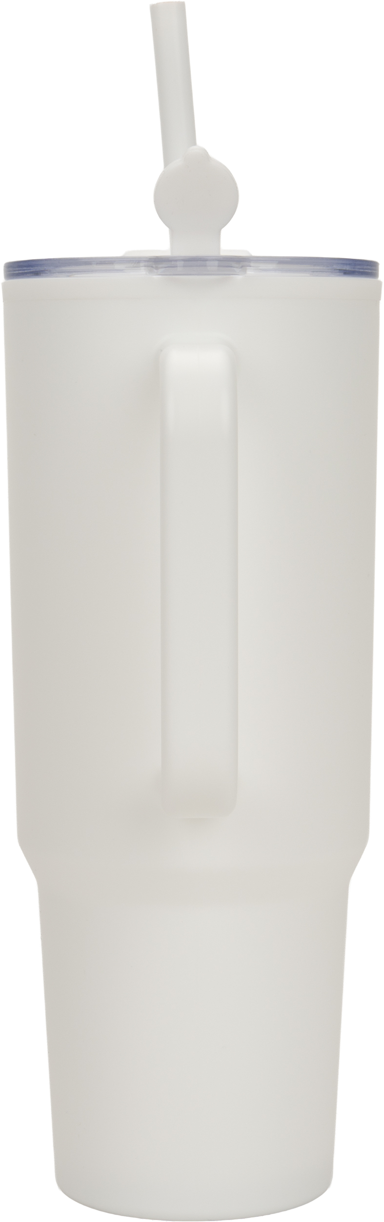 Kubek XXL, o pojemności 1200 ml, z podwójnymi ściankami, uchwytem do przenoszenia i słomką do picia.