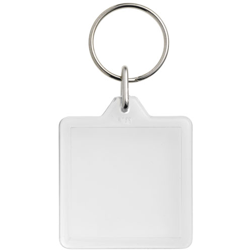 Prostokątny breloczek U1 z metalowym pękiem na klucze. Metalowy pierścień cechuje płaski profil, który idealnie nadaje się do wysyłek. Wymiary wkładu do druku: 3,2 cm x 3,2 cm.