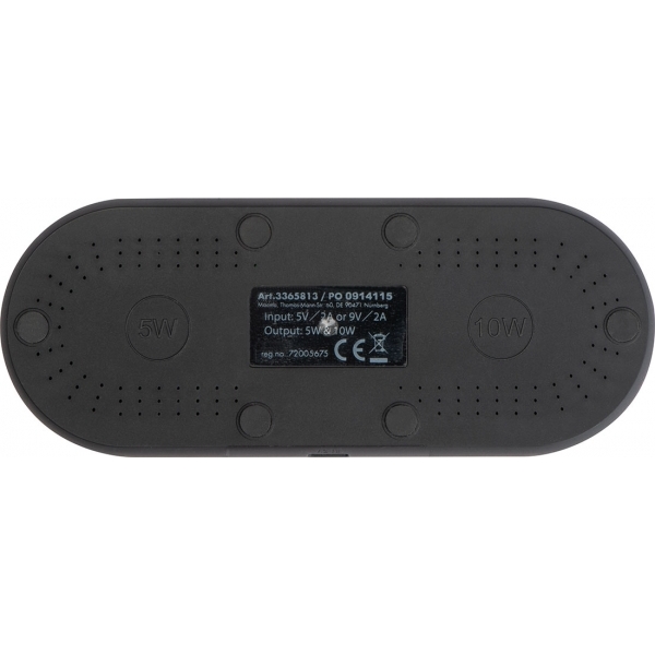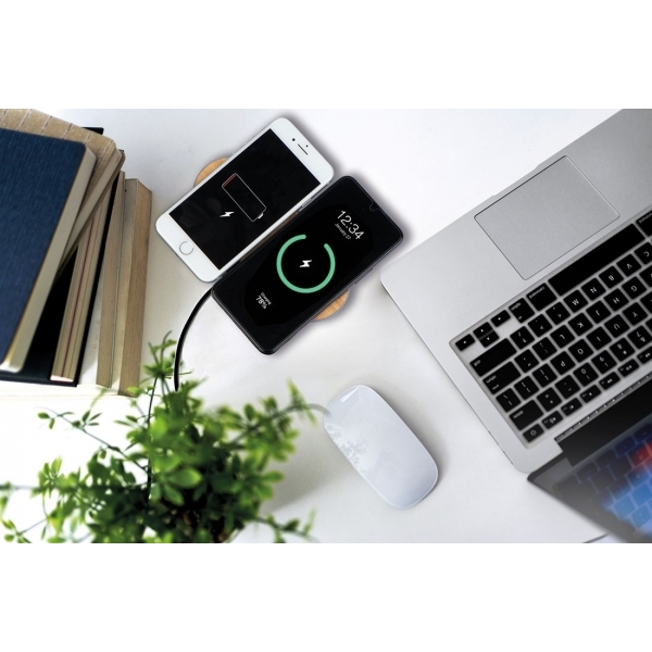 Podłużna ładowarka indukcyjna, wykonana z plastiku i bambusa. Posiada dwa punkty ładowania, dzięki czemu można ładować na raz dwa telefony. Kabelek USB jest dołączony do zestawu.