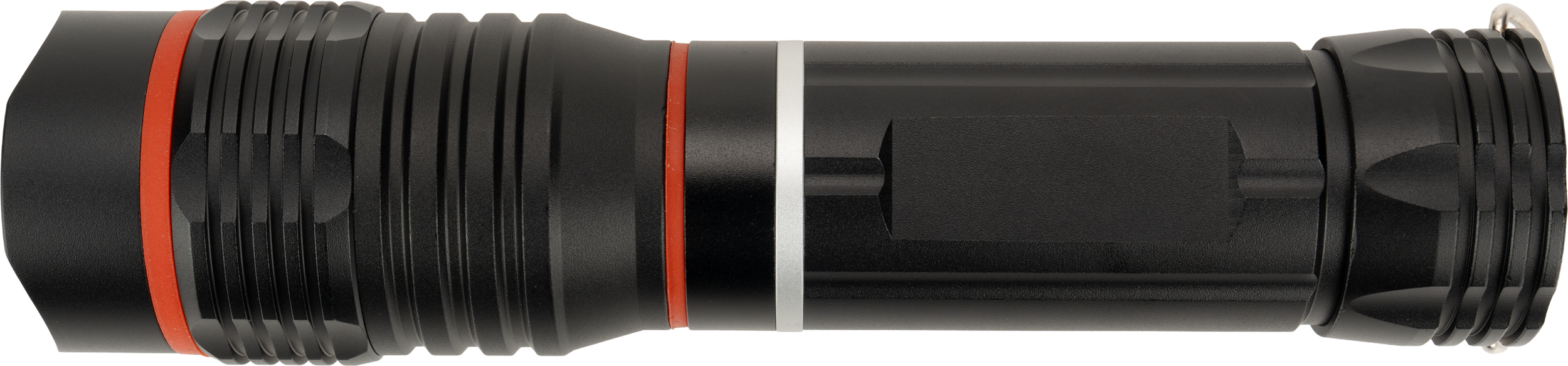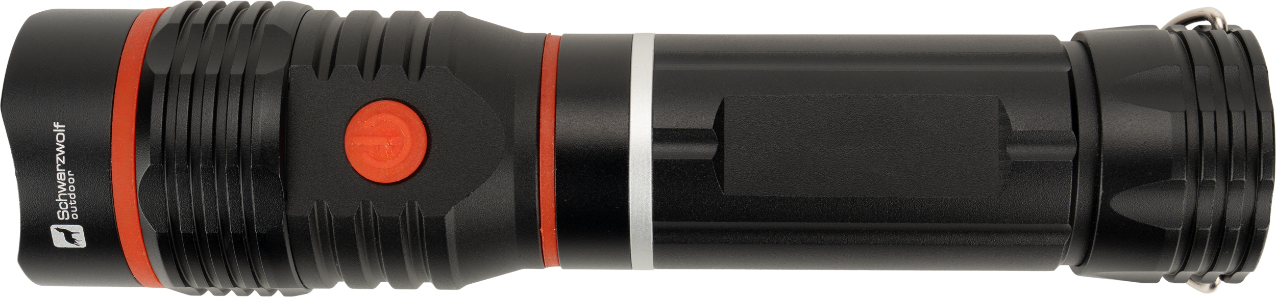 Latarka metalowa Schwarzwolf z diodą CREE XPE oraz intensywnie świecącą diodą COB w rozsuwanej części. Na końcówce latarki znajduje się magnes oraz haczyk do zawieszania. Bateria 4× AAA w zestawie. Jasność: CREE XPE: 130 lumenów; COB: 180 lumenów.