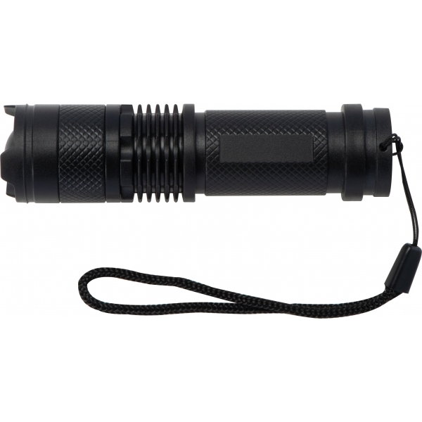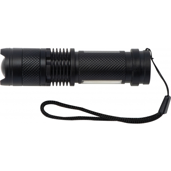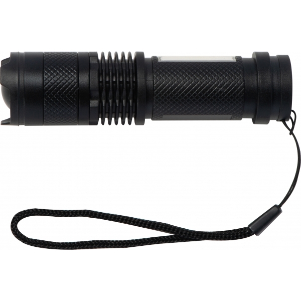 Plastikowa latarka COB, z dwoma trybami świecenia (zwykły i migający), latarka posiada focus, którym można regulować rozproszenie światła oraz dodtkową lampkę na rączce. Latarka ładowana jest na kabel USB-C, dołączony do zestawu.