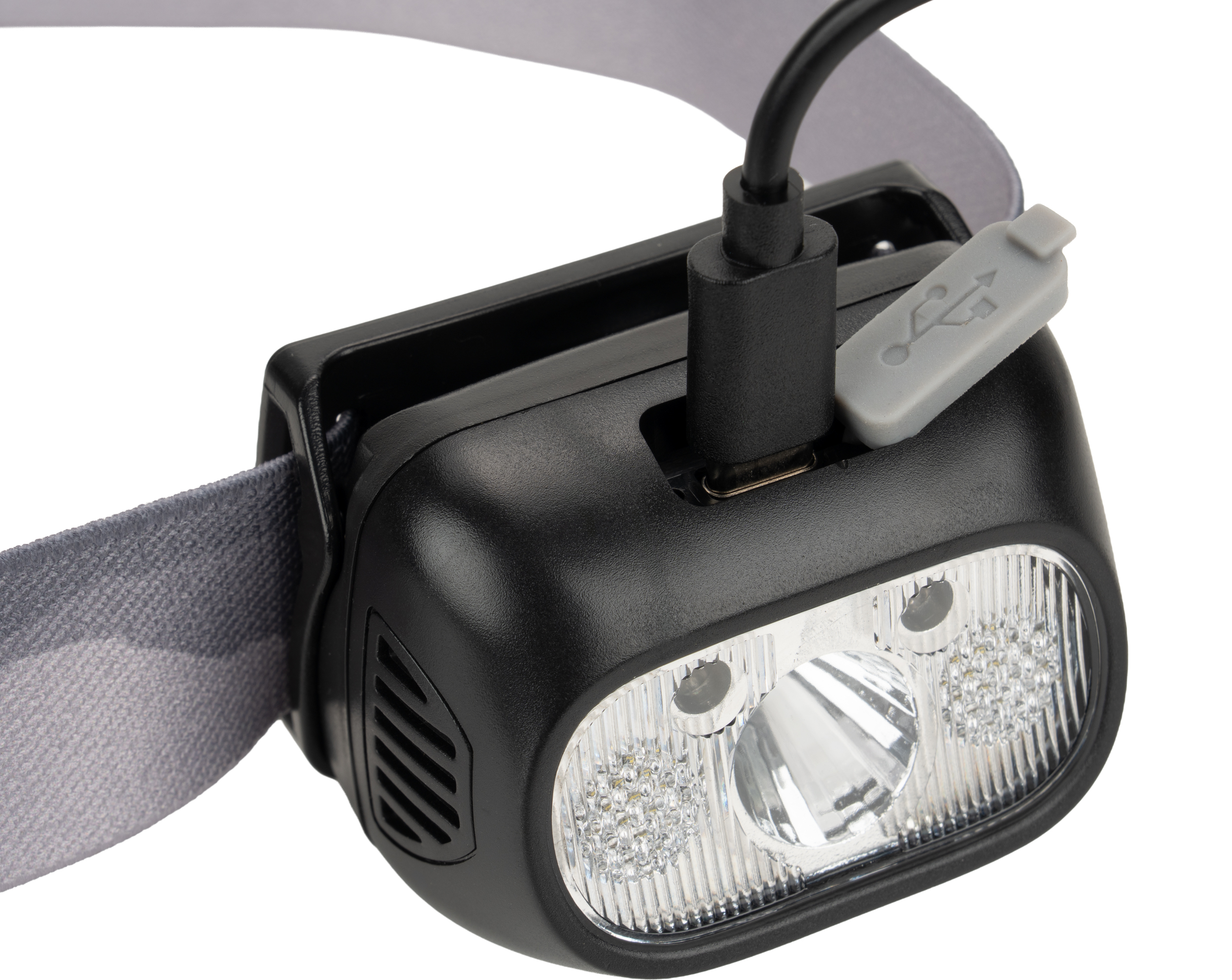 Latarka na głowę wyposażona w 5 diod LED, posiada 3 tryby świecenia - mocny, słaby, czerwone światło. W pełni naładowana latarka działa 6-12h. Moc: 250 lumenów. W zestawie kabelek do ładowania z końcówką typu C. Wymiary lampki - 6 x 4,2 x 4 cm, pasek - 62 x 2,5 cm.