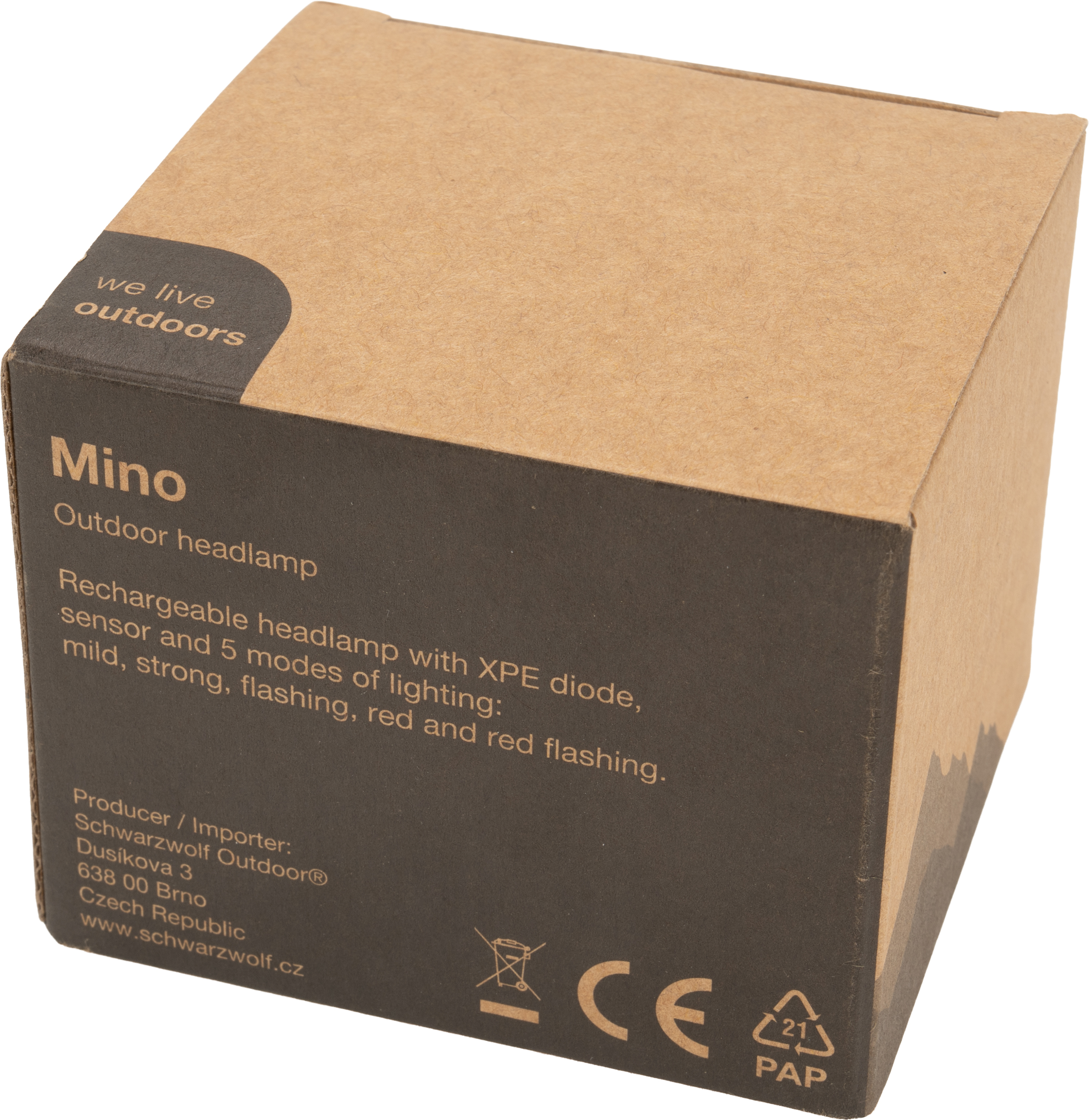 Latarka na głowę marki Schwarzwolf z diodą XPE. Posiada sensor dzięki któremu można włączać i wyłączać latarkę za pomocą gestu i 5 trybów świecenia: słabe światło, mocniejsze, miganie, czerwone światło oraz czerwone migające światło. W zestawie z gumką na głowę z logiem Schwarzwolf. Latarka ładowana USB typ C (kabel w zestawie). Gdy bateria jest w pełni naładowana, świeci do 7 godzin. Jasność: 120 lumenów.