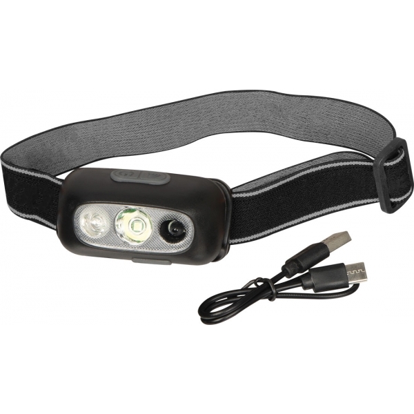 Latarka czołówka, na regulowanej elastycznej opasce. Latarka świeci z mocą 100 lumenów, posiada baterię o pojemności 400 mAh, ładowaną na USB typu C.