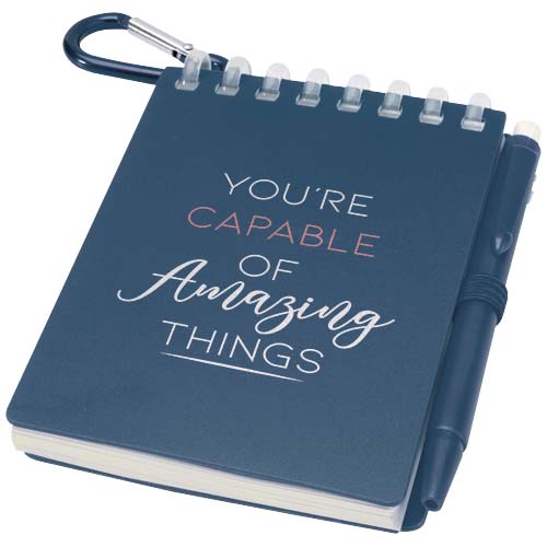 Lig zestaw mini notatnika oraz długopisu to kompaktowe i praktyczne rozwiązanie do robienia notatek w podróży. Notatnik w oprawie spiralnej ma miękką okładkę z recyklingowanego plastiku i 70 czystych kartek z papieru kamiennego o gramaturze 120 g/m², odpornego na działanie wody, dzięki czemu idealnie nadaje się do użytku na zewnątrz. Dzięki zaokrąglonym narożnikom i wbudowanej pętelce na długopis wpisuje się w trend miniaturyzacji, zachowując jednocześnie funkcjonalność. Dopasowany długopis jest wykonany z plastiku ABS z recyklingu, ma czarny tusz i oferuje długość pisania 250 metrów. Metalowy pierścień w dopasowanym kolorze umożliwia łatwe przymocowanie zestawu do plecaka, torebki lub łańcucha do kluczy, dzięki czemu idealnie nadaje się do sporządzania trwałych notatek w dowolnym miejscu. Rozmiar notatnika: 11 x 7,5 cm.