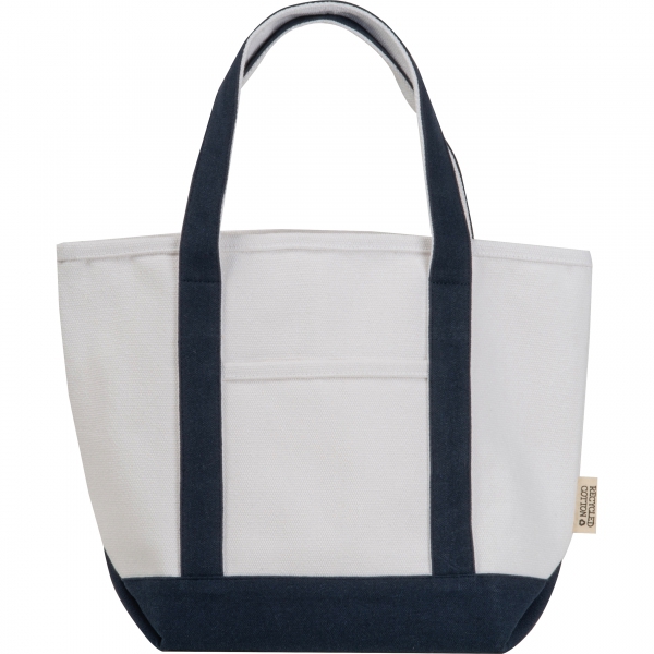 Mała torba o gramaturze 730 g/m2, wykonana z bawełny pochodzącej z recyklingu z długimi kolorowymi uchwytami.