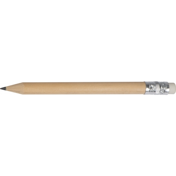 Mały ołówek z białą gumką do zmazywania, zatemperowany.