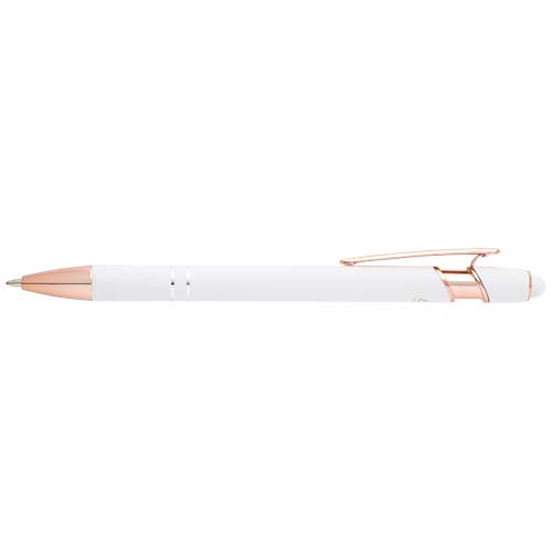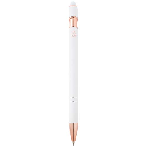 Długopis Nanna z wykończeniem w kolorze różowego złota ma korpus wykonany z aluminium z recyklingu i rysik dotykowy wykonany z silikonu. Aluminium z recyklingu ogranicza ilość odpadów na wysypiskach śmieci i pomaga chronić zasoby naturalne w celu zmniejszenia emisji gazów cieplarnianych. Kolor tuszu: Niebieski. Żywotność: 800 metrów. Rozmiar stalówki: 1,0 mm.