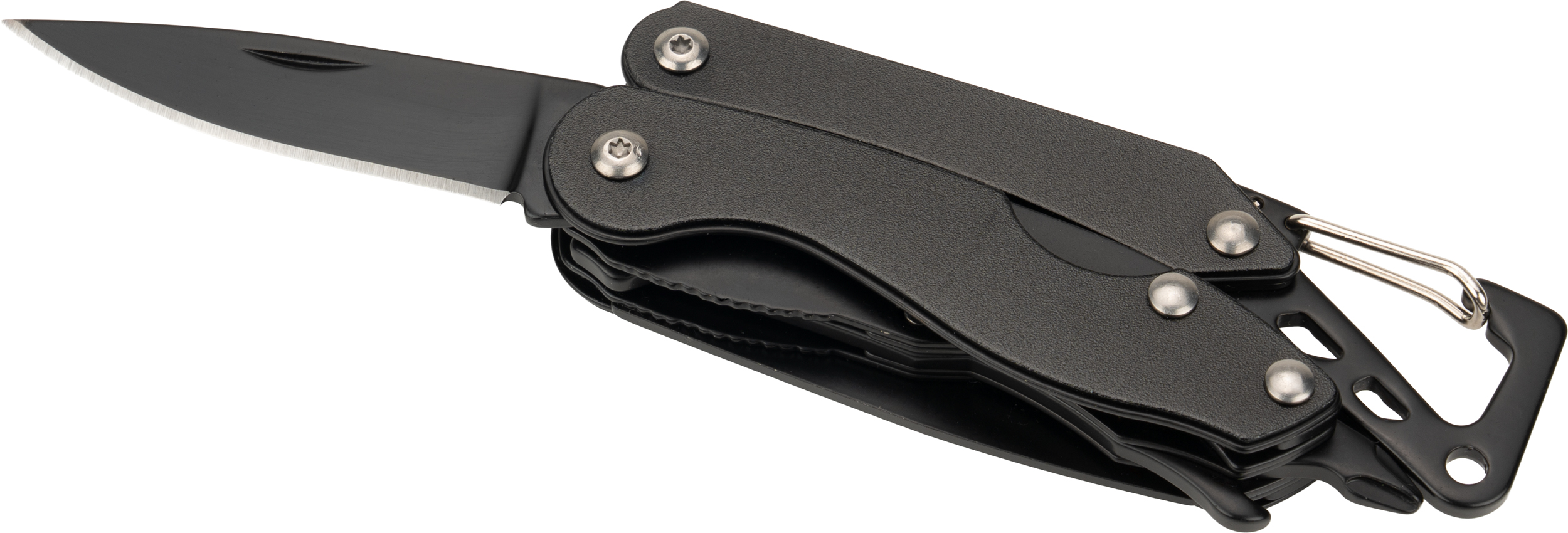 Wielofunkcyjne narzędzie z 6 funkcjami: nóż, piła, szczypce, karabińczyk, otwieracz do butelek i śrubokręt Phillips.