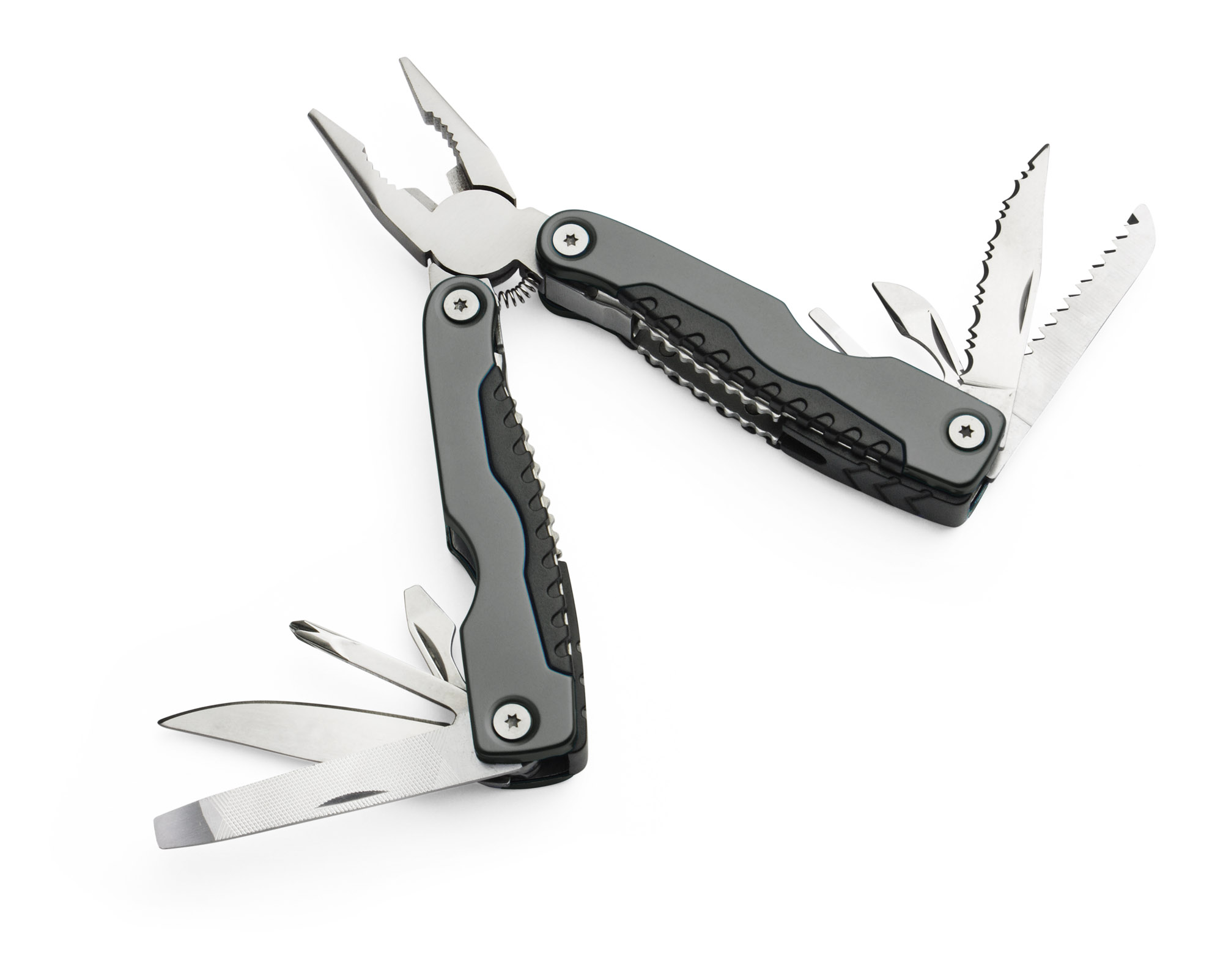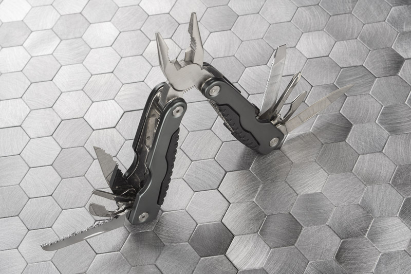Metalowe narzędzie wielofunkcyjne zawierające w swoim składzie wszystkie potrzebne rzeczy do przeprowadzenia podstawowych prac. Przyrząd składa się z kombinerek, piłki do drewna, dwóch otwieraczy (do konserw i kapsli), pilnika do drewna i metalu, śrubokręta płaskiego, śrubokręta krzyżakowego i nożyków o ostrzach płaskim i ząbkowanym. Logo wygrawerujemy na powierzchni narzędzia.