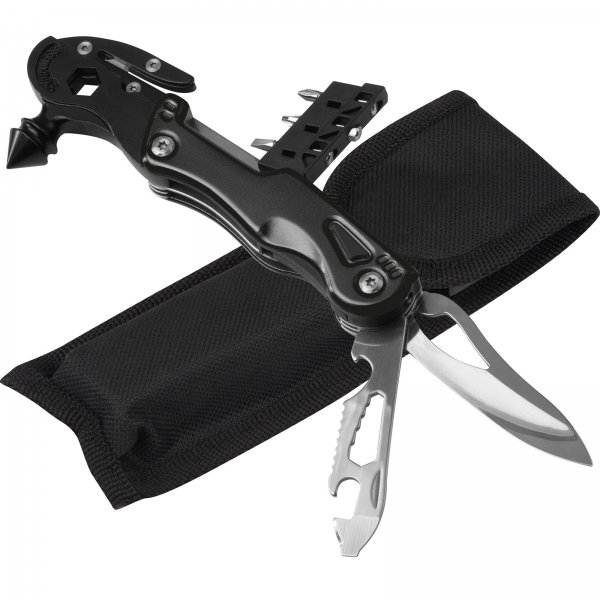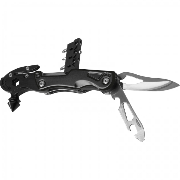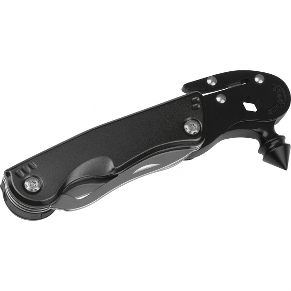 Narzędzie wielofunkcyjne wykonane z trwałego metalu to niezbędny element wyposażenia każdego, kto ceni sobie przygotowanie na niespodziewane sytuacje. Wyposażone w praktyczną lampkę LED, zapewnia doskonałe oświetlenie w warunkach ograniczonej widoczności, co zwiększa bezpieczeństwo i komfort użytkowania. Solidny młotek awaryjny umożliwia szybkie rozbicie szyby w nagłych wypadkach, a wbudowany śrubokręt i klucz ułatwiają drobne naprawy i regulacje. Dodatkowo, narzędzie posiada otwieracz do butelek oraz nóż, który sprawdzi się w wielu codziennych czynnościach. Przecinak do pasów bezpieczeństwa gwarantuje szybkie i bezpieczne uwolnienie się z zablokowanego pasa w sytuacjach kryzysowych.
