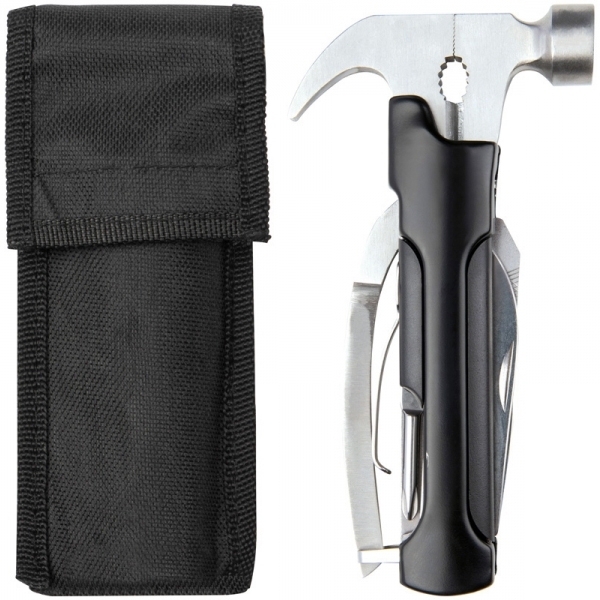 Młotek wykonany ze stali nierdzewnej, posiada 9 funkcji. Produkt zapakowany w etui z poliestru.