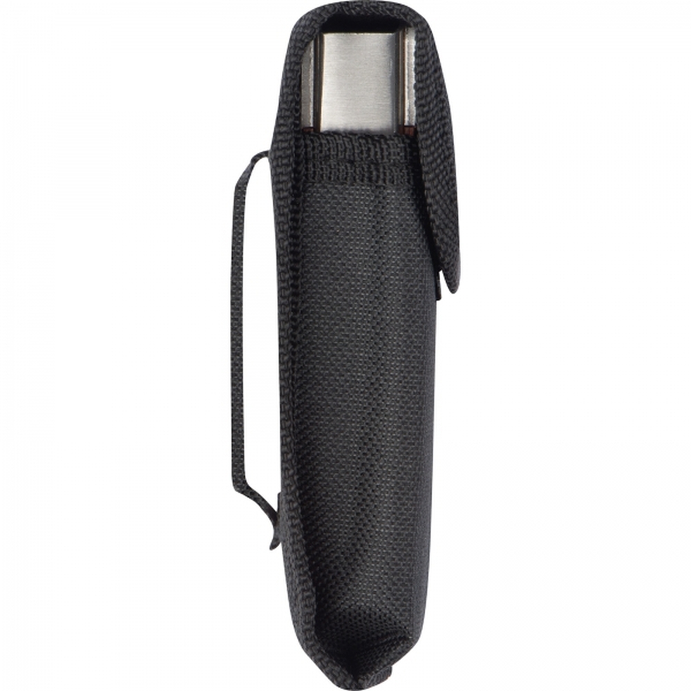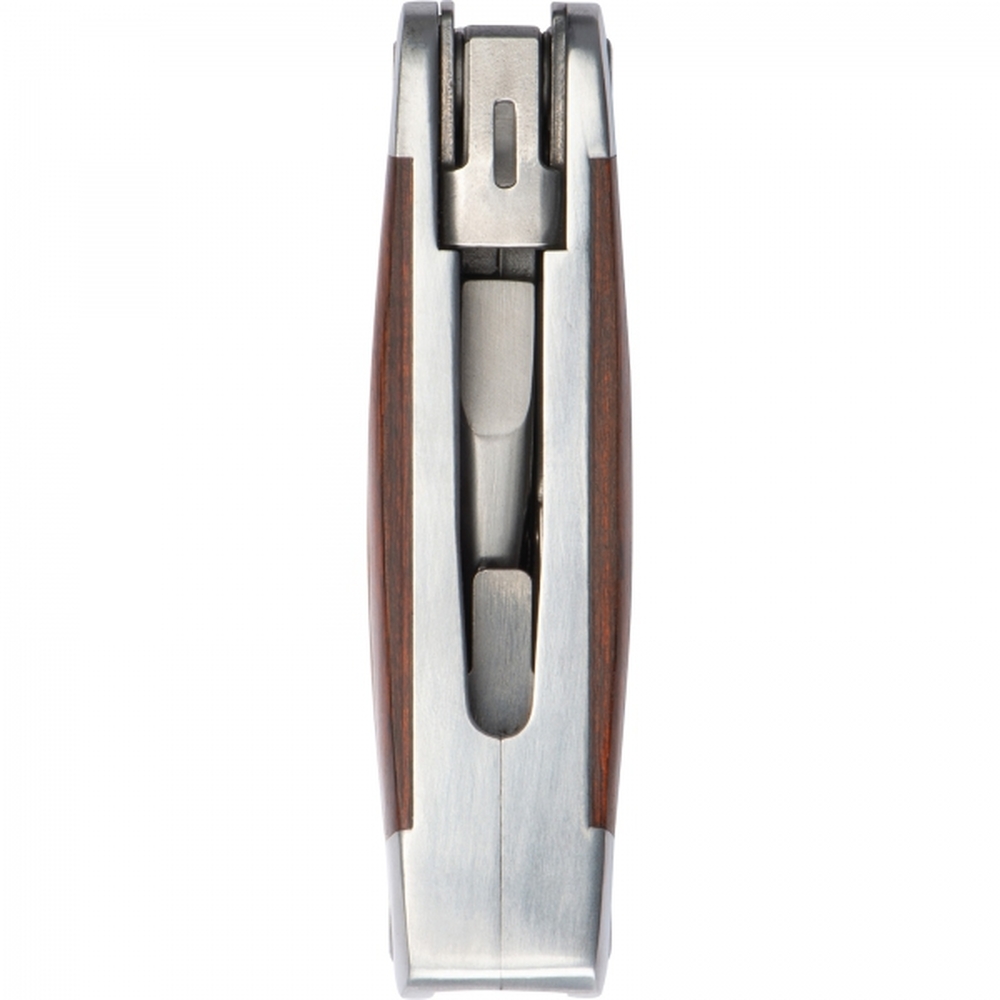 Wielofunkcyjny przyrząd ze stali nierdzewnej z drewnianymi uchwytami. Narzędzie wyposażono w nożyk, kombinerki, piłkę, nożyczki i śrubokręt.