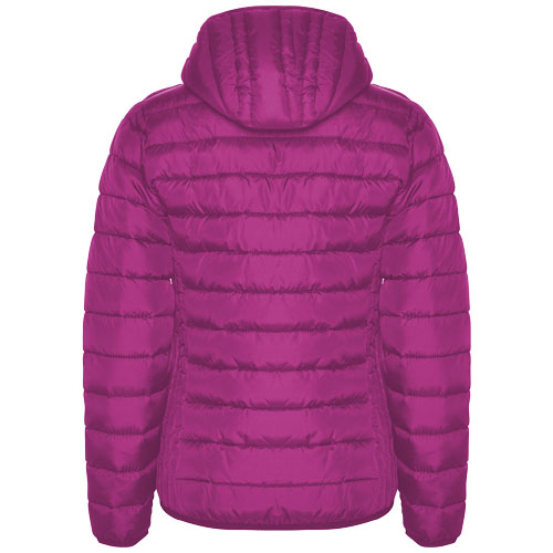 Damska pikowana kurtka z dopasowanym kapturem z materiału przypominającego w dotyku pierze. Odwrócone zamki błyskawiczne z dopasowaną osłoną podbródka. Dwie przednie kieszenie zapinane na zamek. Dopasowane elastyczne wykończenia mankietów, dołu i kaptura. Kontrastowa wewnętrzna podszewka. Dołączona torba transportowa. Lekka i składana odzież. Dopasowany krój. Wodoodporna. Model wiatroszczelny.