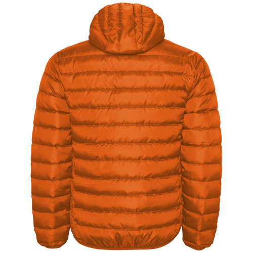 Męska pikowana kurtka z dopasowanym kapturem z materiału przypominającego w dotyku pierze. Odwrócone zamki błyskawiczne z dopasowaną osłoną podbródka. Dwie przednie kieszenie zapinane na zamek. Dopasowane elastyczne wykończenia mankietów, dołu i kaptura. Kontrastowa wewnętrzna podszewka. Lekka i składana odzież. Wodoodporna. Model wiatroszczelny.