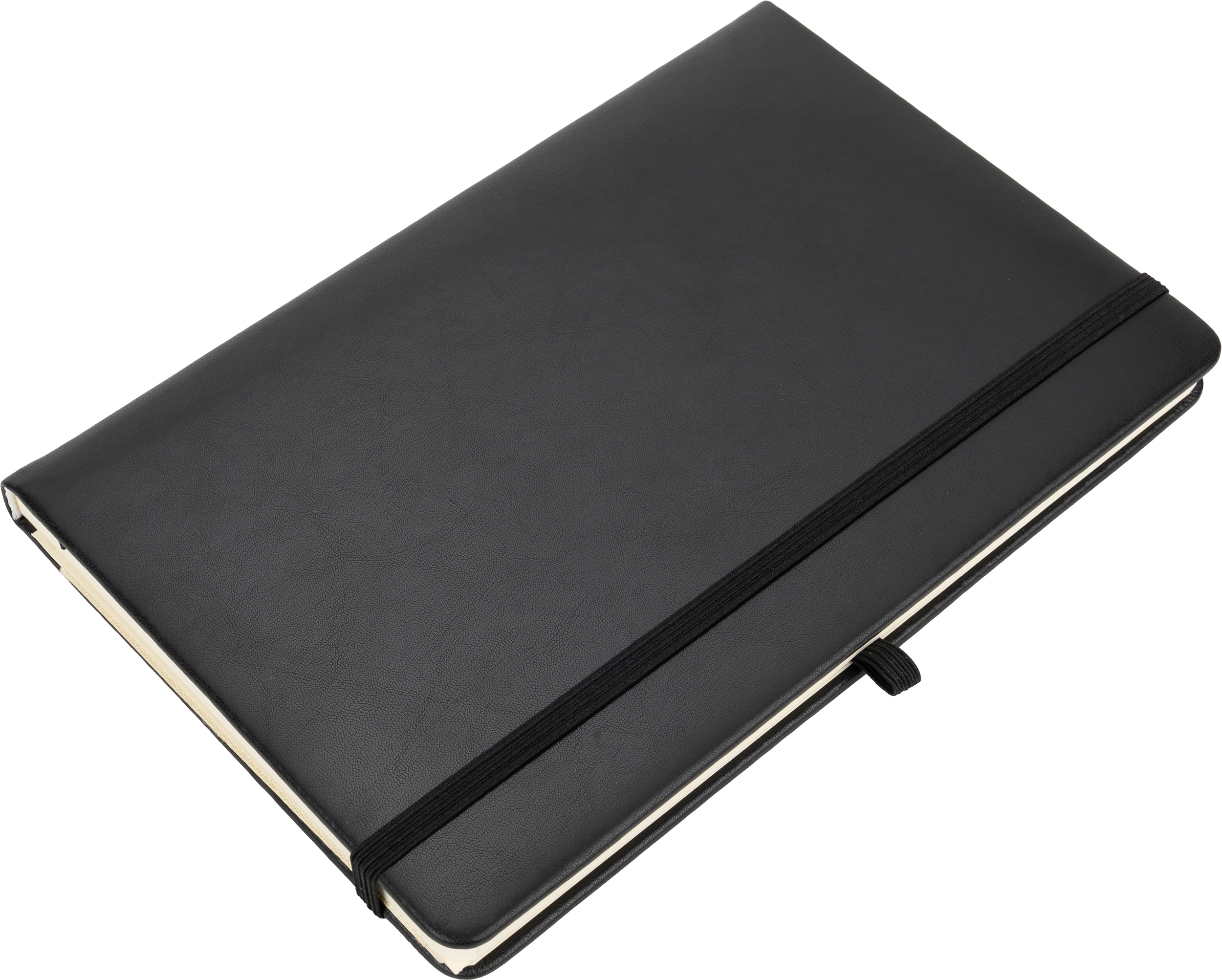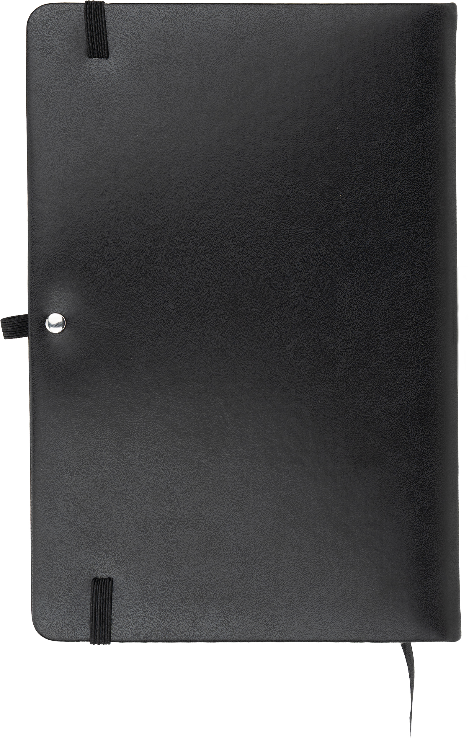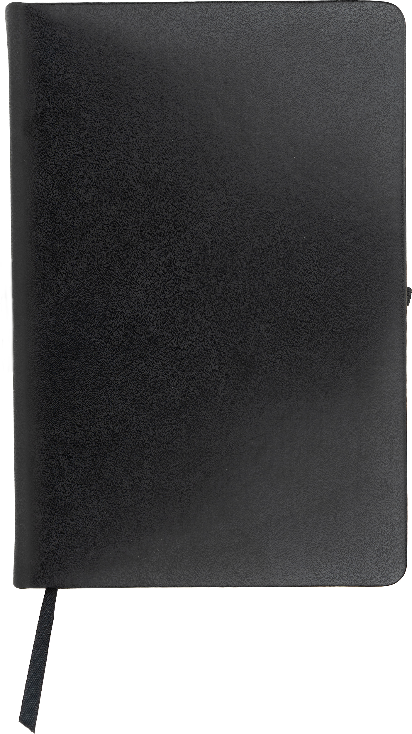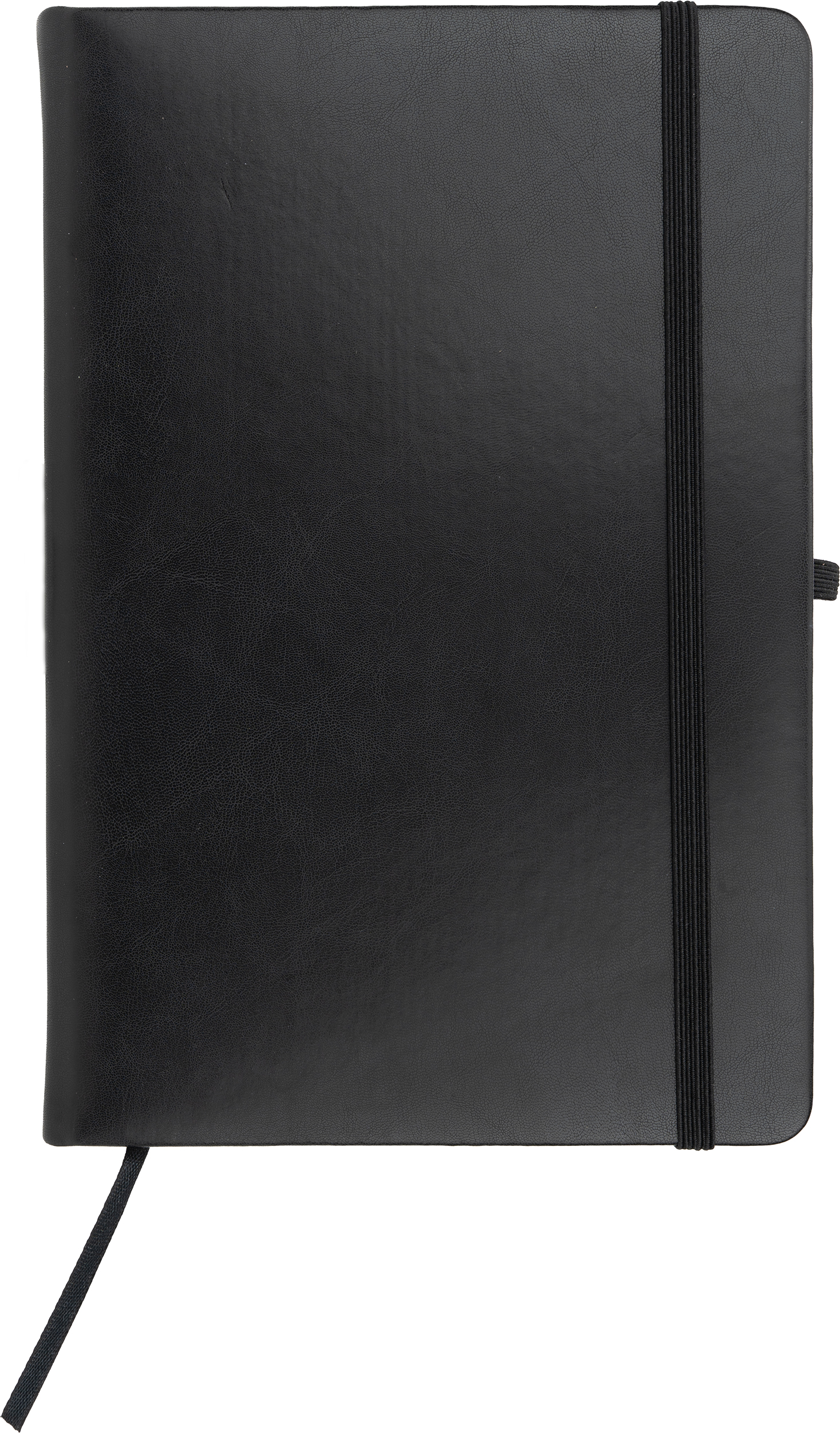 Notatnik A5 z okładką z imitacji skóry, 80 kartkami w linie, zakładką, miejscem na długopis i kieszonką na wewnętrznej stronie okładki. Zamykany elastyczną taśmą.