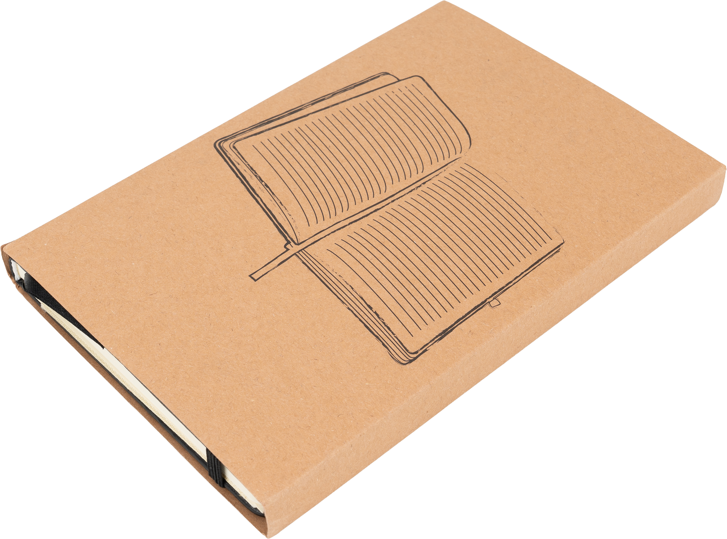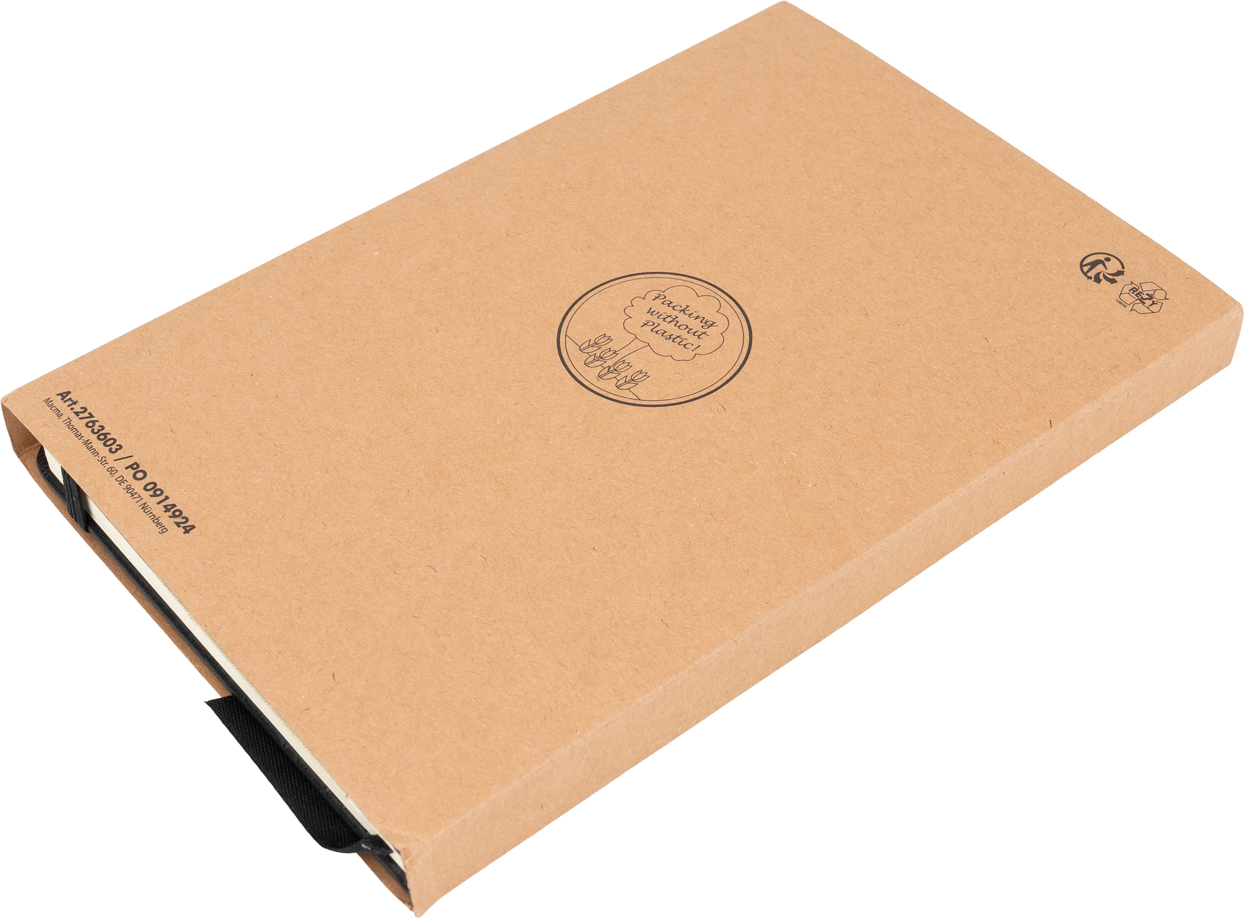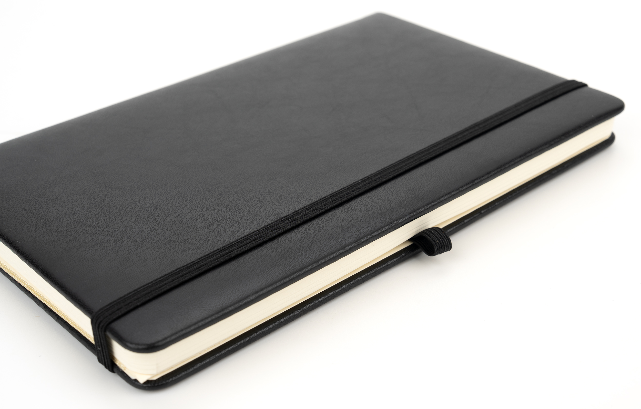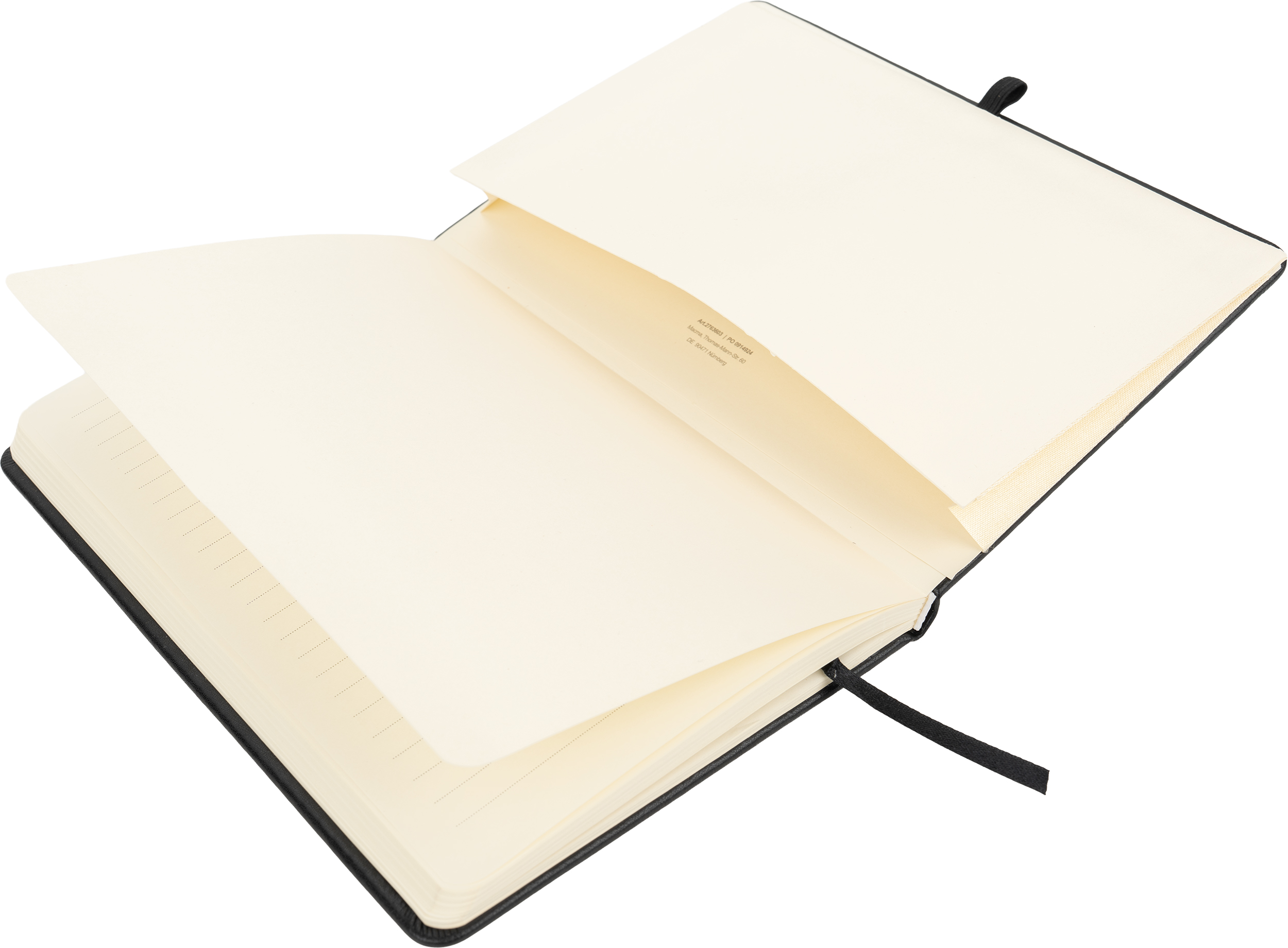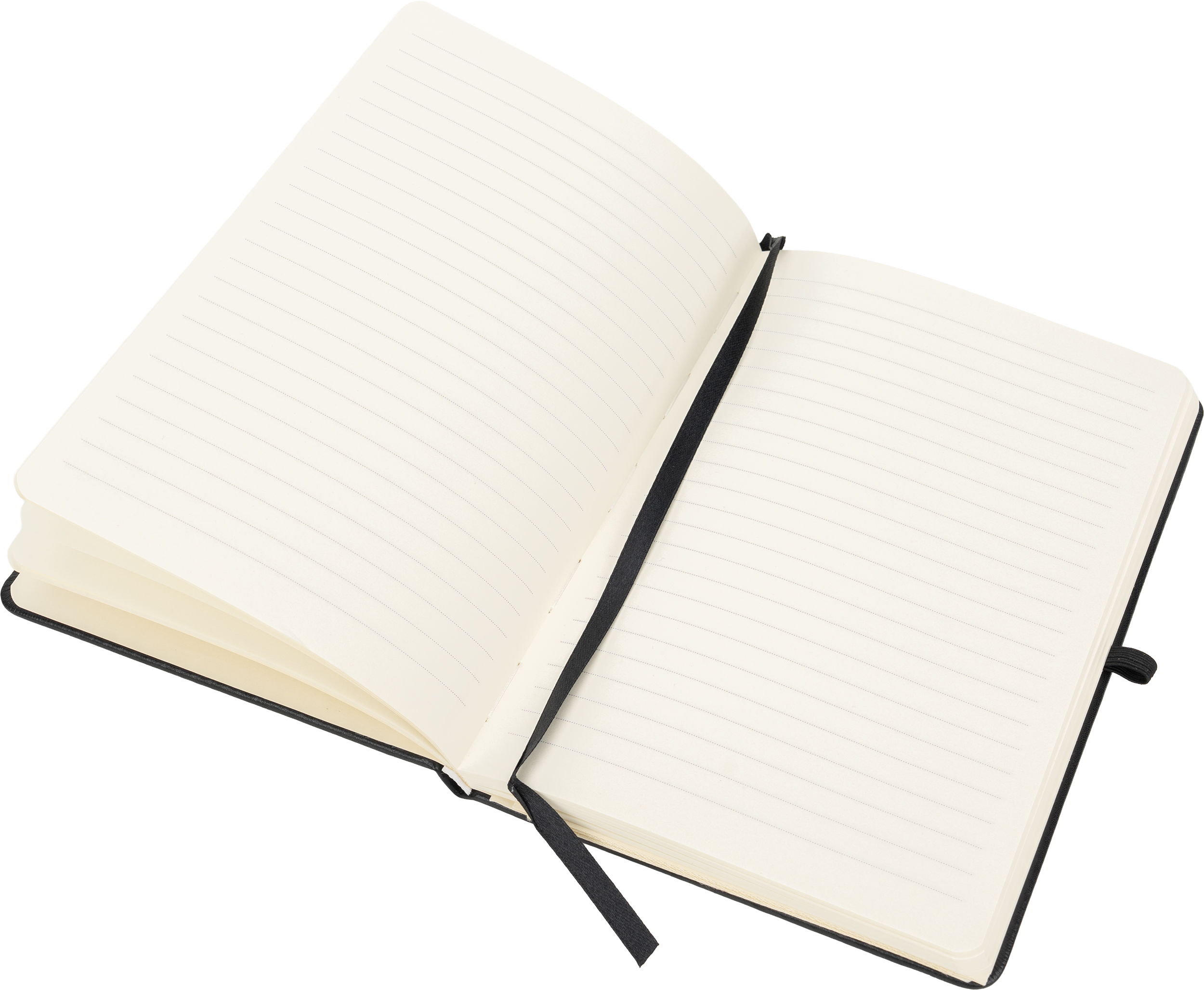 Notatnik A5 z okładką z imitacji skóry, 80 kartkami w linie, zakładką, miejscem na długopis i kieszonką na wewnętrznej stronie okładki. Zamykany elastyczną taśmą.