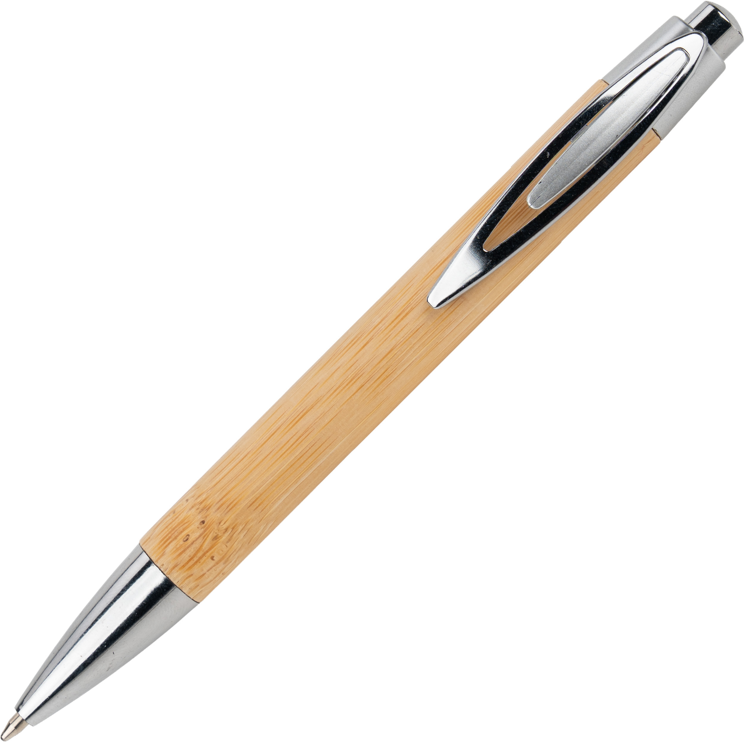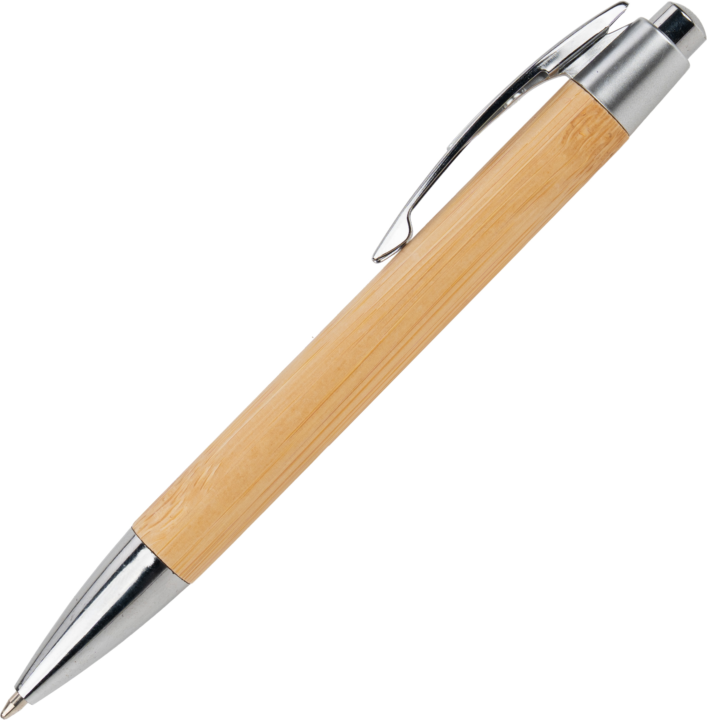 Notes A5 w okładce z bambusa. Zawiera 140 stron z niebielonego papieru w linie pochodzącego z recyklingu, a także bambusowy długopis z niebieskim wkładem.