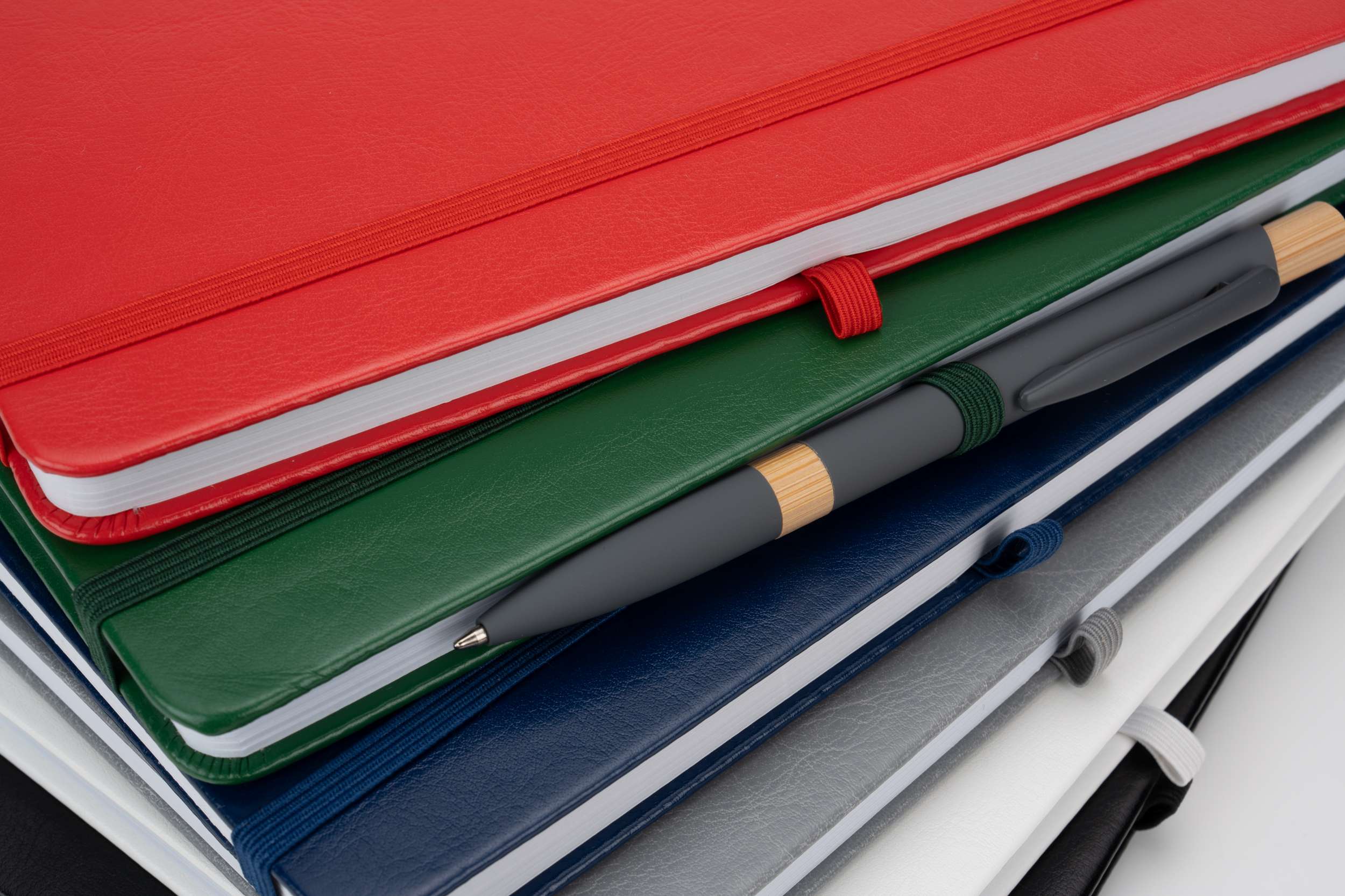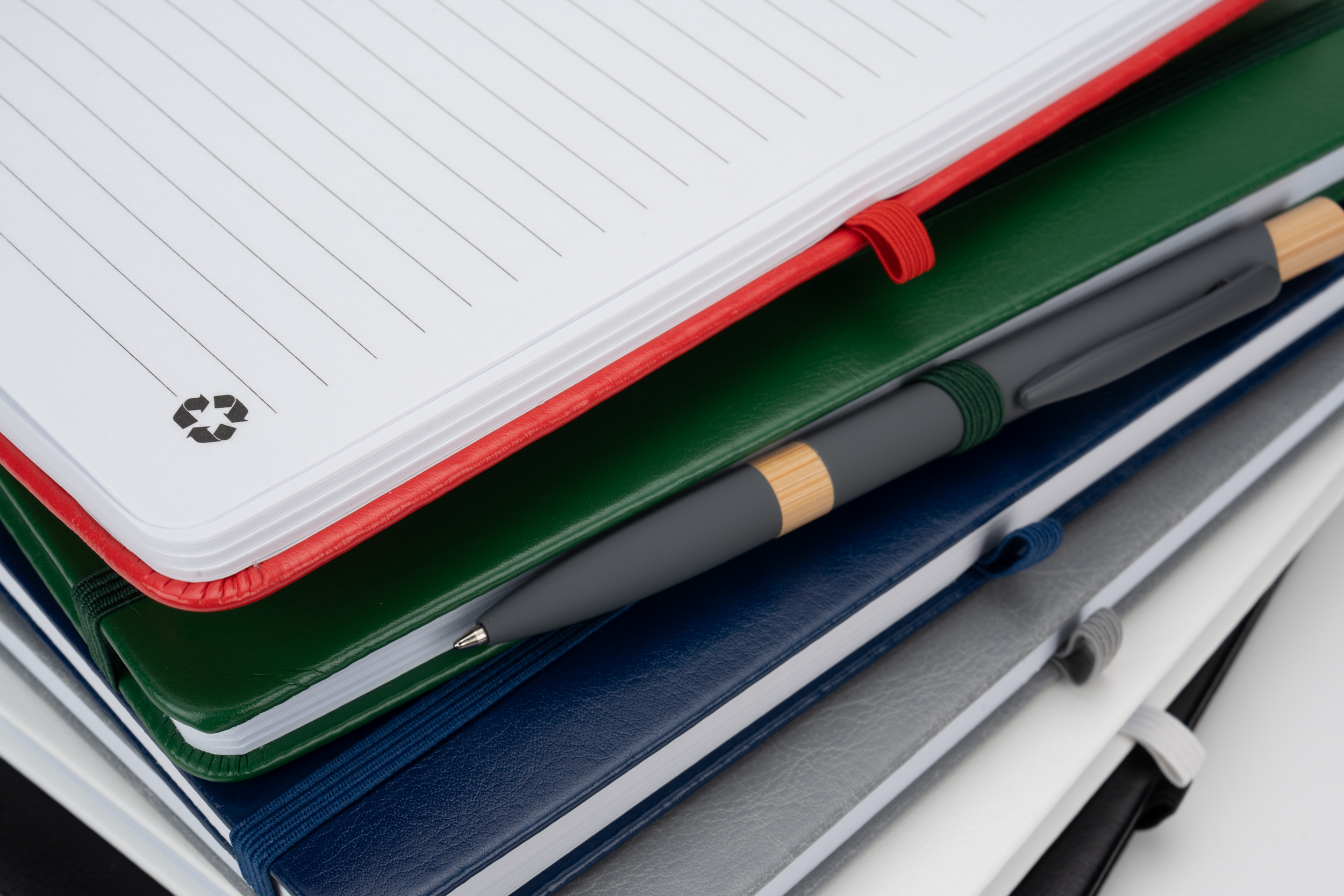 Notatnik A5 w linie z okładką wykonaną z PU pochodzącego z recyklingu to doskonałe połączenie stylu, ekologii i funkcjonalności. Kompaktowy format A5 sprawia, że jest wygodny w codziennym użytkowaniu – idealny do biura, szkoły czy osobistych zapisków. Dzięki 192 kartkom w linie oferuje obszerną przestrzeń do notowania, planowania oraz organizacji myśli. Solidne zamknięcie na gumkę gwarantuje bezpieczeństwo zawartości i utrzymanie estetycznego wyglądu. Materiałowa zakładka pozwala szybko odnaleźć ważne strony, a praktyczna pętelka na długopis zapewnia, że narzędzie do pisania zawsze pozostanie pod ręką.