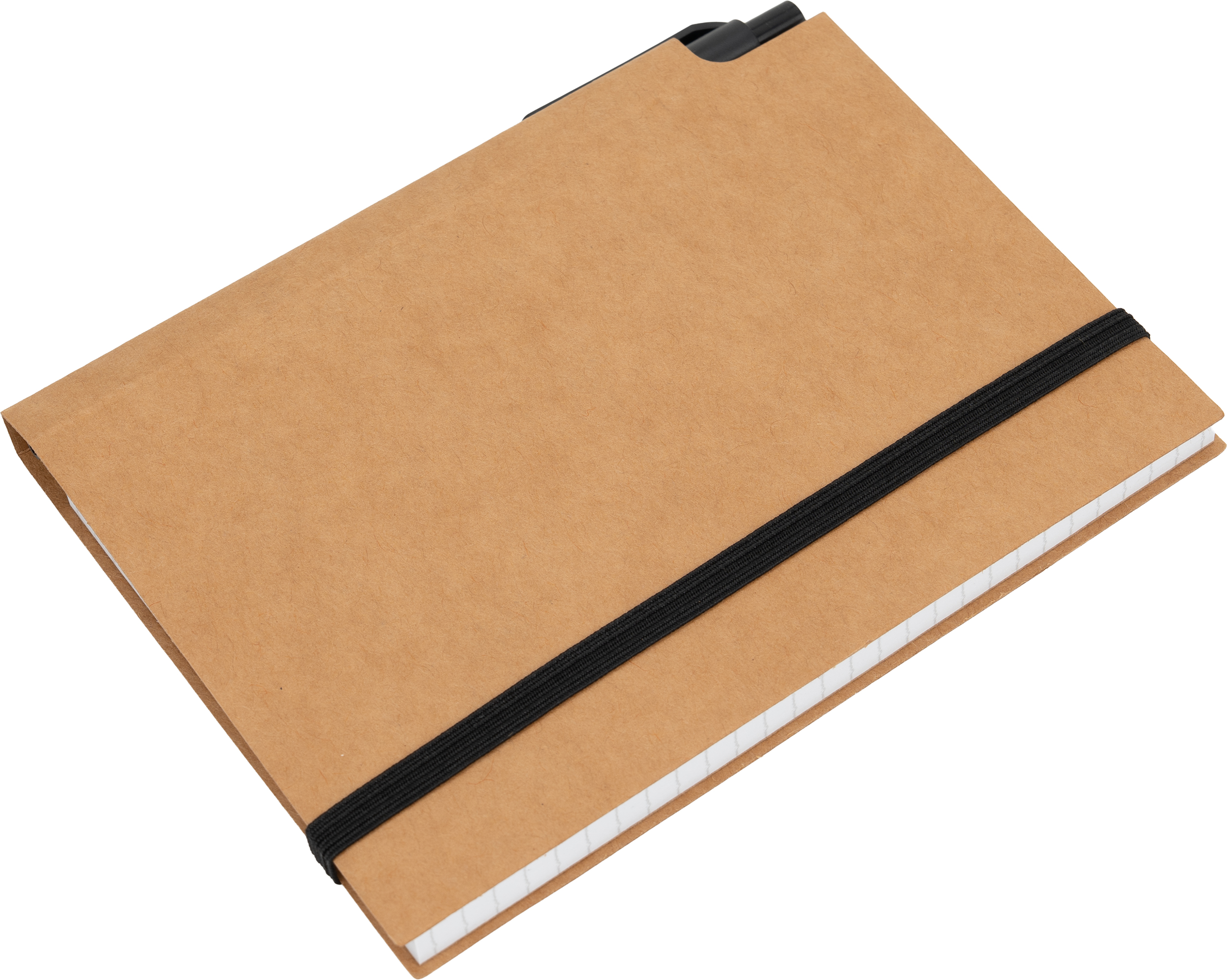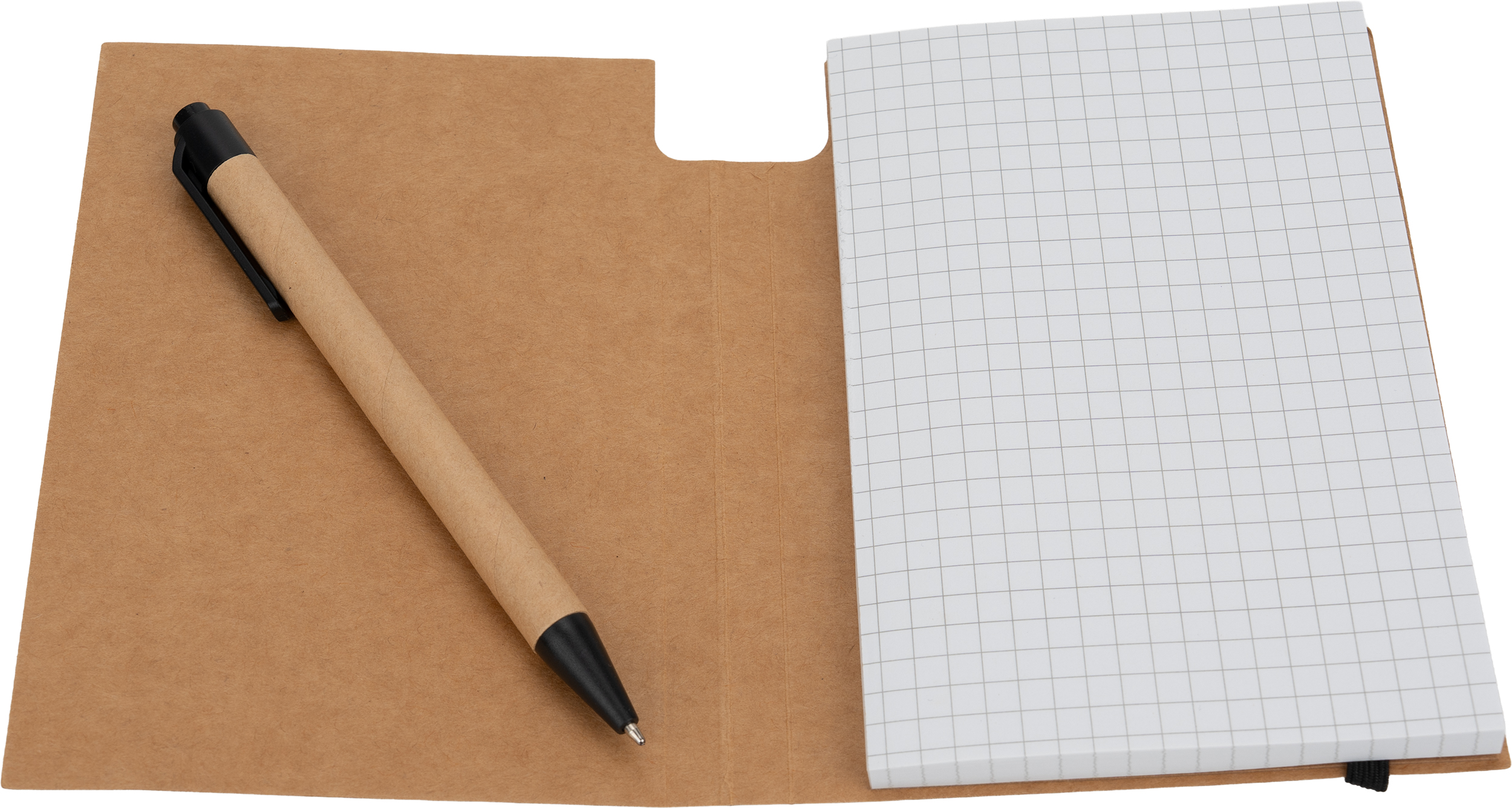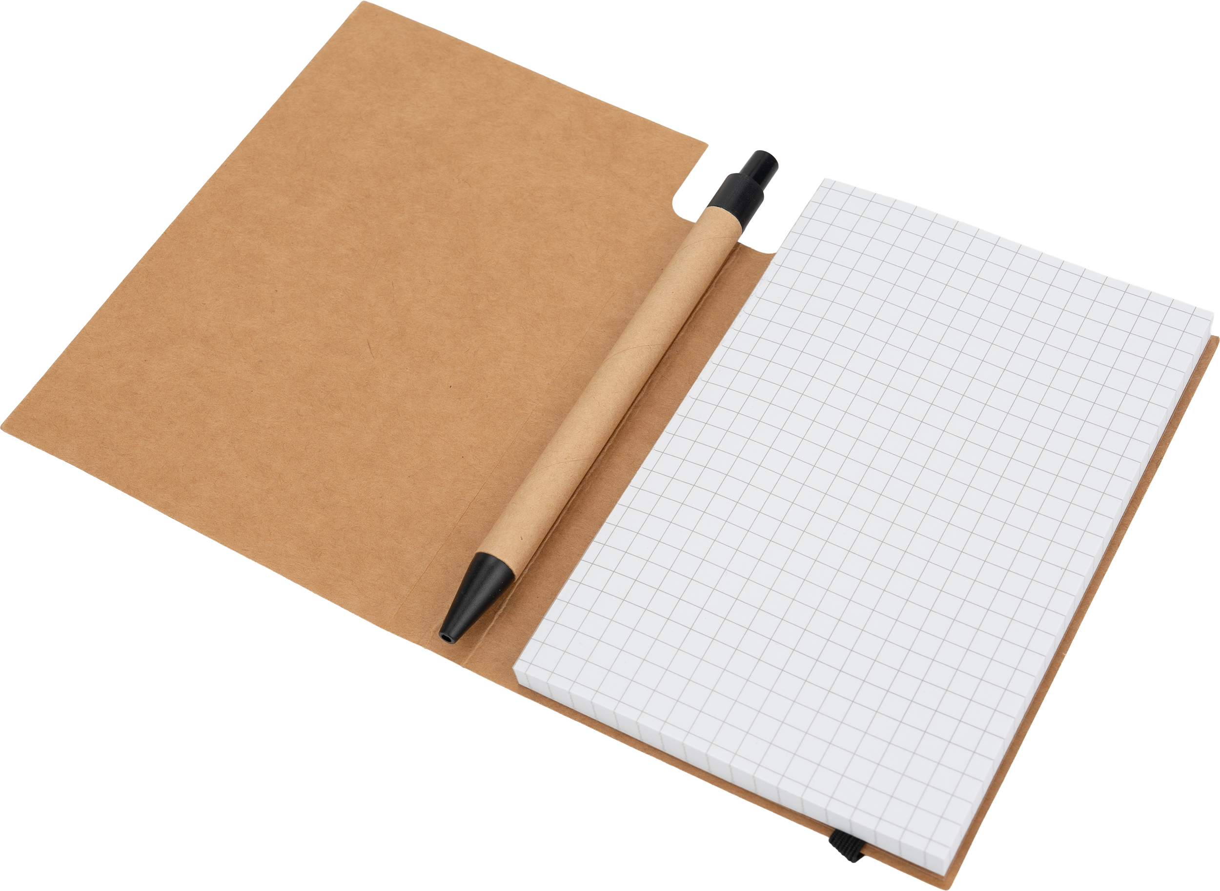 Mały notes (160 stron w kratkę) z ekologiczną okładką z kartonu i gumką do zamykania. W zestawie z długopisem.