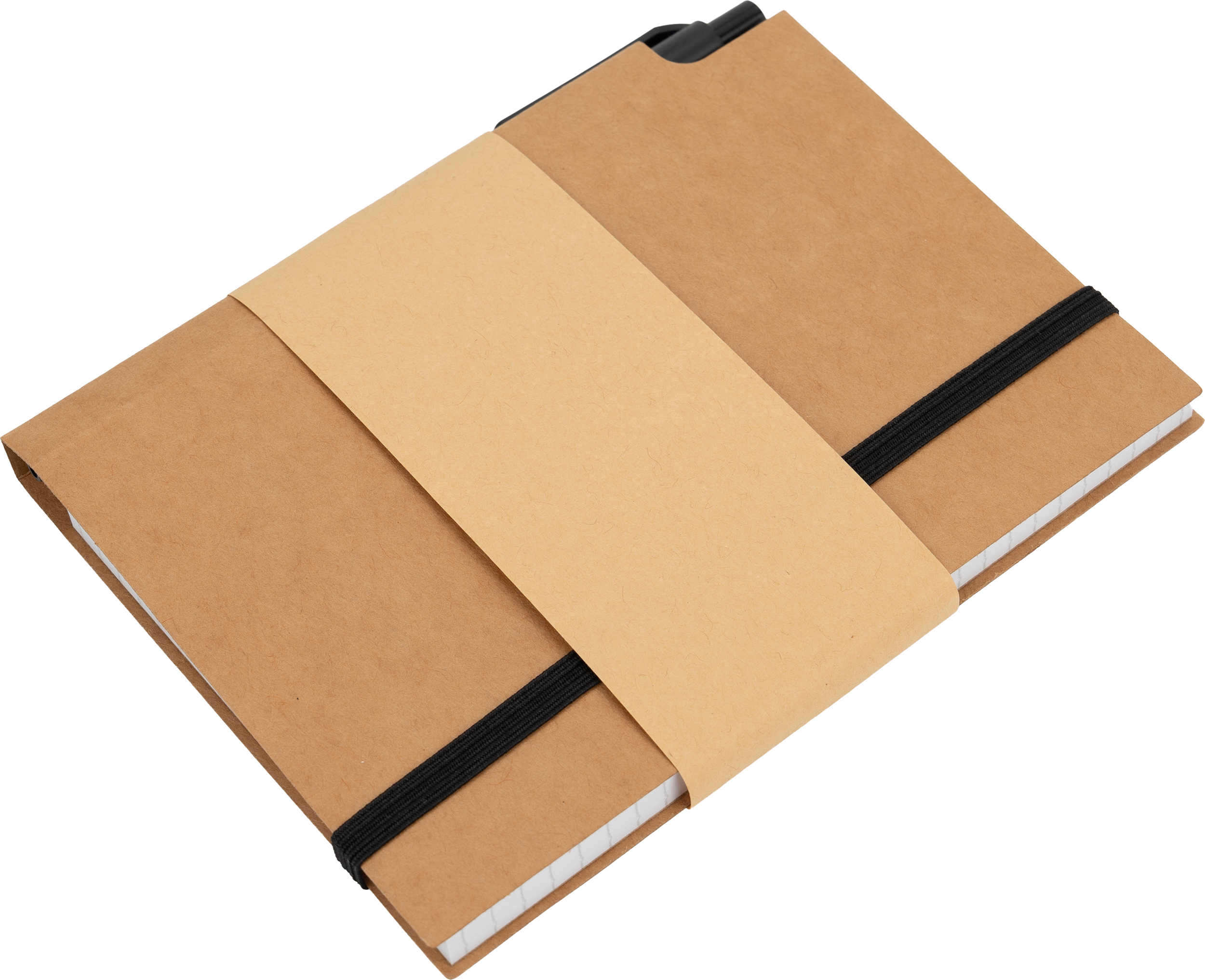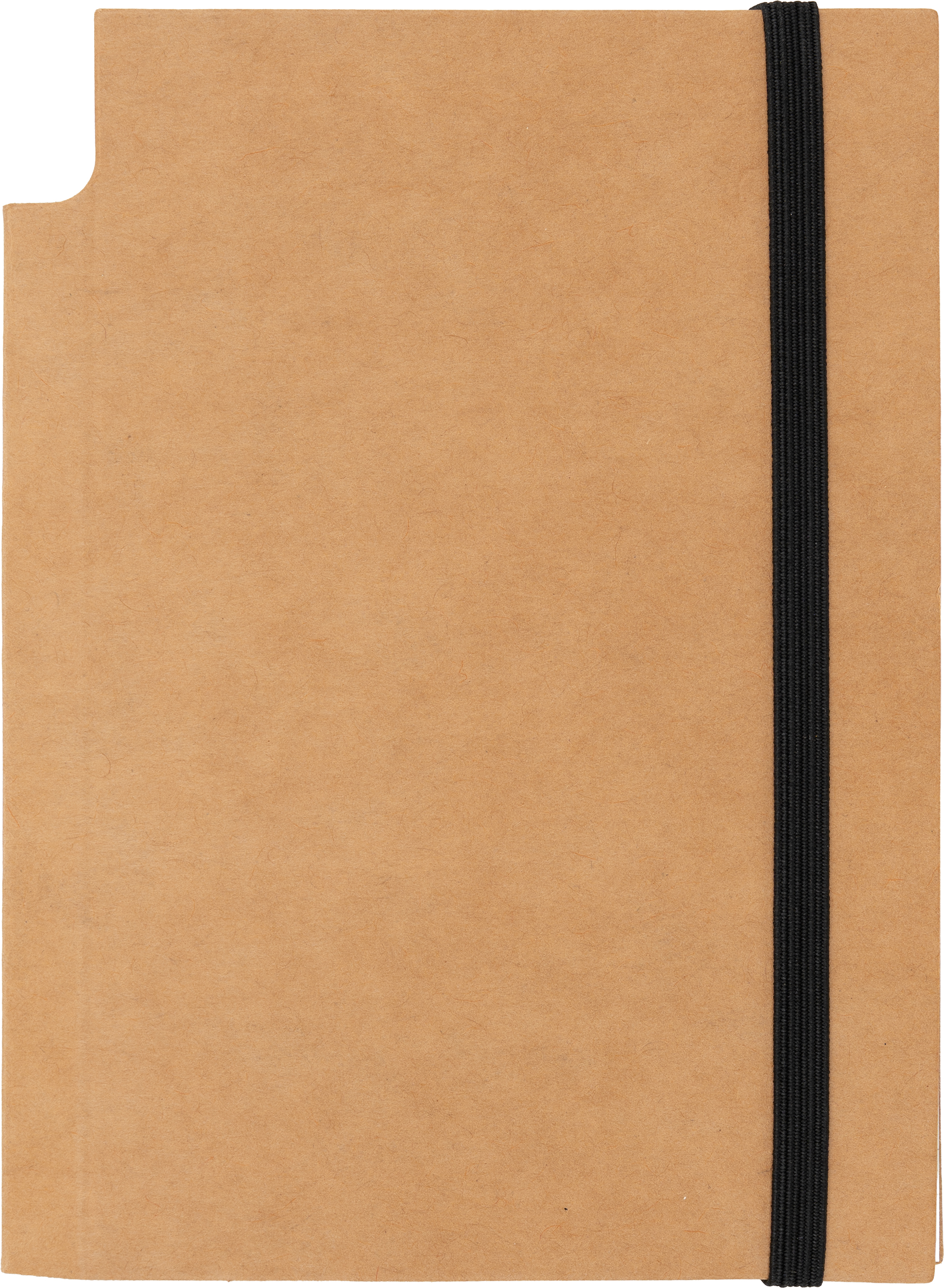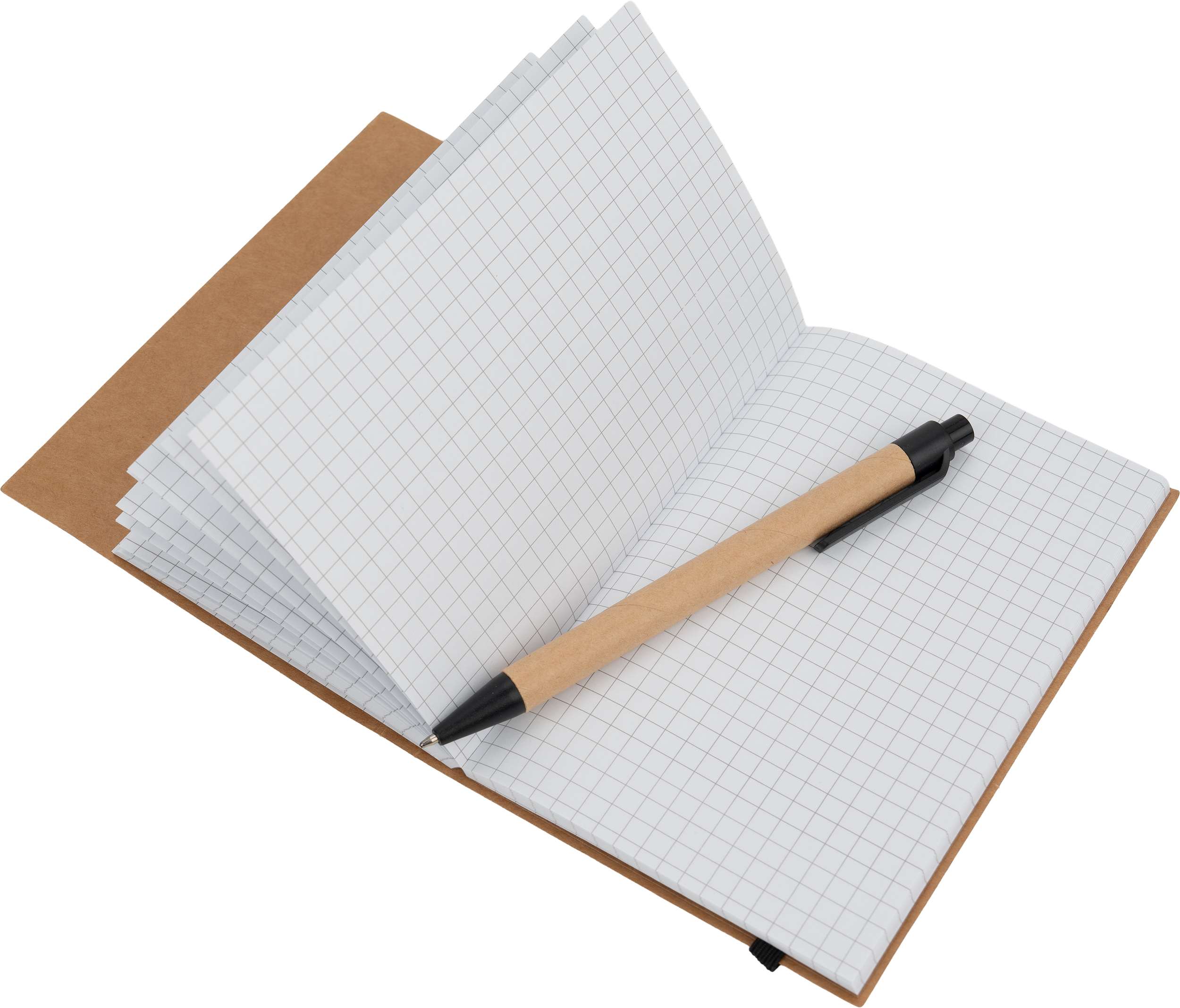 Mały notes (160 stron w kratkę) z ekologiczną okładką z kartonu i gumką do zamykania. W zestawie z długopisem.