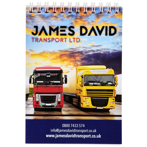 Notes na spirali Desk-Mate® w formacie A6. Notatnik zawiera białą lub czarną przedziałkę. Dostępny w różnych rozmiarach. Obity w lakierowaną, twardą okładkę (250g/m2) z czystymi kartkami (80g/m2). Standardowo 50 kartek, dostępny również w wersji 80 kartek. Możliwość zdobienia okładki i każdego arkusza.