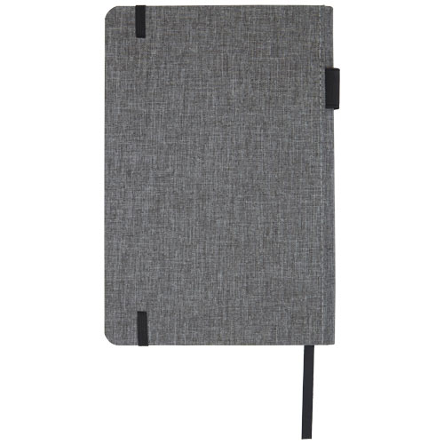 Notatnik w formacie A5 z okładką wykonaną z materiału RPET. Posiada 96 arkuszy w linie o gramaturze 70 g/m² z papieru z recyclingu, pętelkę na pióro i wstążkę. Pakowany w kartonowe opakowanie.