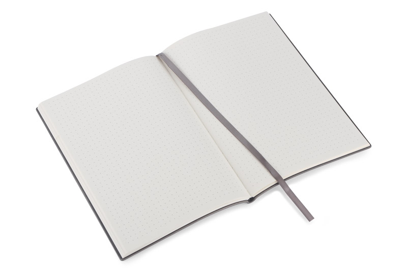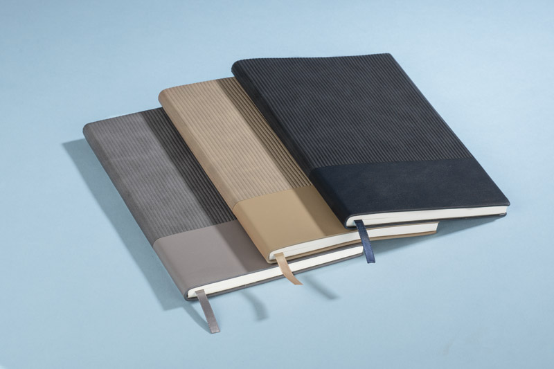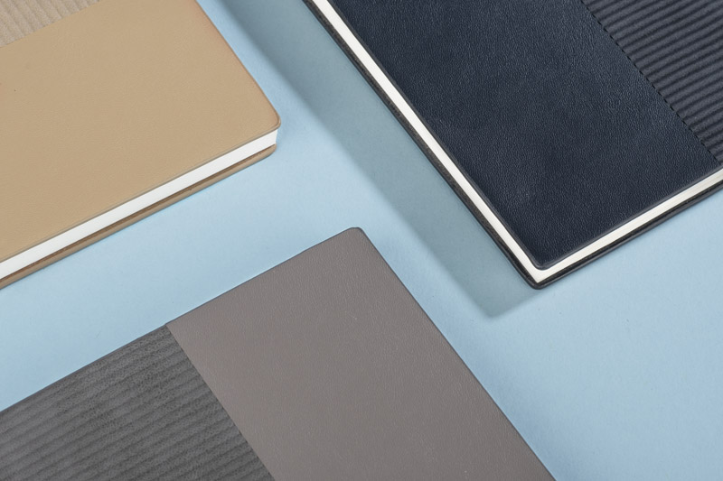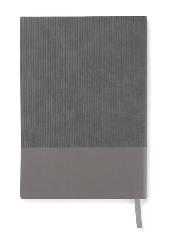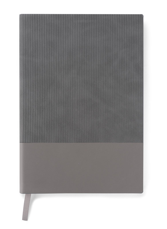 Notes FLAF w formacie A5 ma miękką okładkę łączącą materiał skóropodobny (PU) z imitacją sztruksu, co nadaje mu przyjemną, tekstylną fakturę. W środku znajduje się 80 kartek w kropki oraz praktyczna wstążka pełniąca funkcję zakładki.