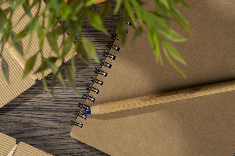 Klasyczny notes na spirali w papierowej, brązowej okładce wraz z miejscem na długopis. Kartki w notesie wykonane są z papieru kamiennego. Papier ten jest wyjątkowo wytrzymały i odporny na wilgoć. Posiada 60 kartek w linie, format A5. Zapakowany w woreczek biodegradowalny.