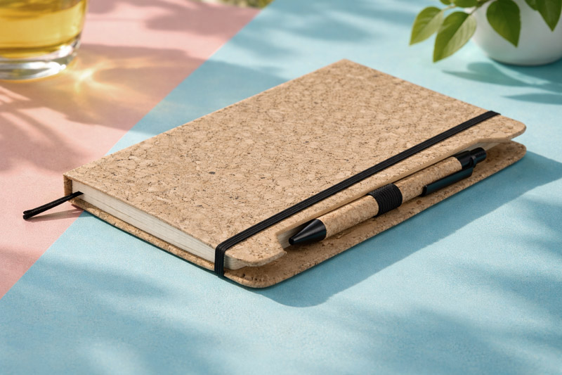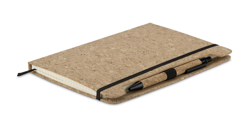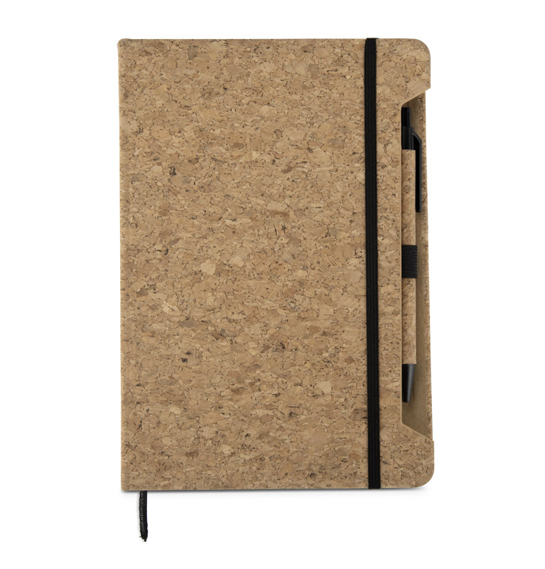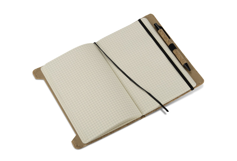 Notes SKRIP A5 przyciąga uwagę okładką z naturalnego korka o wyraźnej, organicznej fakturze. W zestawie znajduje się długopis wykonany częściowo z tego samego materiału, co tworzy spójną i efektowną całość. Wewnątrz znajduje się 80 białych kartek w kratkę (gramatura 70 g/m²), a całość zabezpieczona jest elastyczną gumką. Notes jest szyty, co zapewnia komfort podczas użytkowania i otwierania na płasko. Funkcjonalny i stylowy – doskonały do zestawów promocyjnych lub jako indywidualny upominek reklamowy.