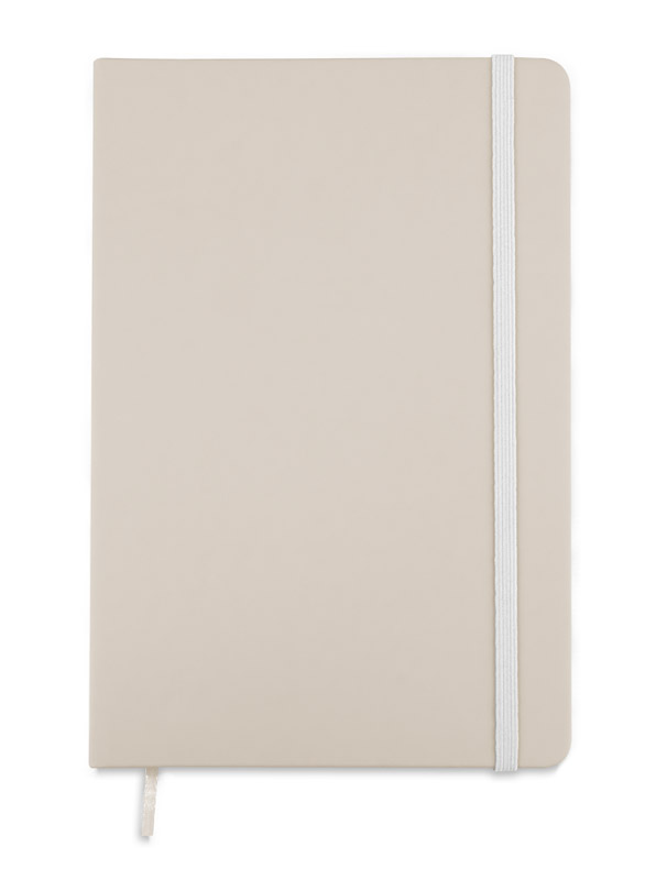 Gustowny notes A5 z kolorową gumką wykonany z materiału skóropodobnego (PU). Notes zawiera 80 kartek ecru w linie koloru pomarańczowego. Logo nadrukujemy na okładce.